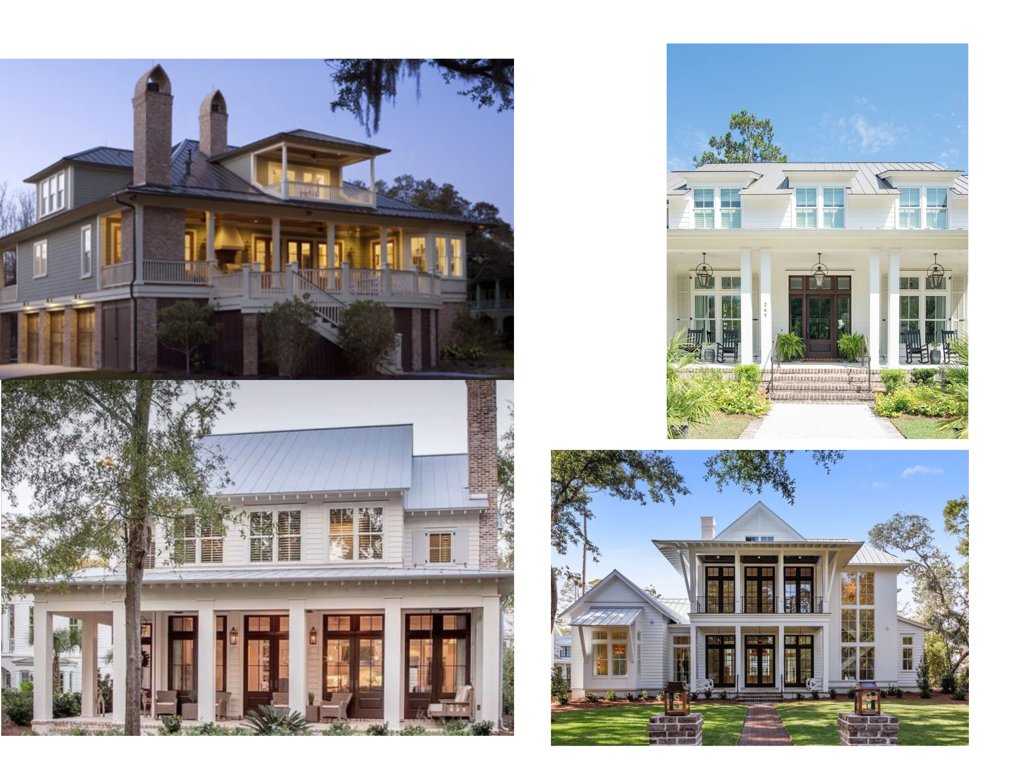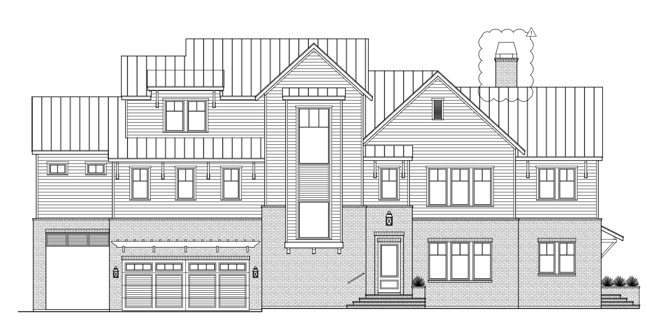 exterior shot gray metal roof greige siding white windows bronze doors wood garage doors light brick