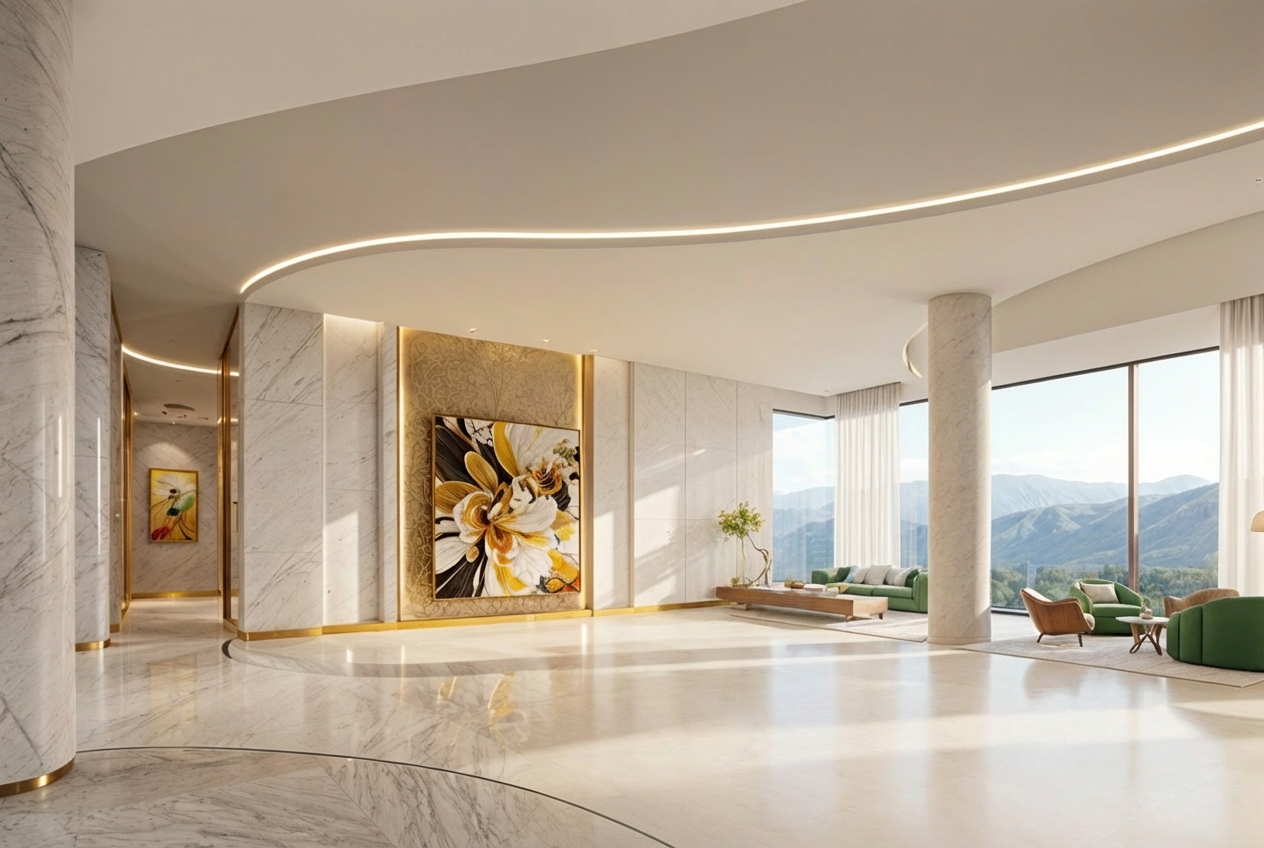 show the kitchen with natural cream cabinets and gold hardware and light fixtures warm white oak flooring stainless steel appliances white walls i want the refrigerator on the far left side of the wall with the window the sink directly under the window centered on the wall on the wall next to that i want the stove centered on the wall with drawers on the bottom cabinets next to it
