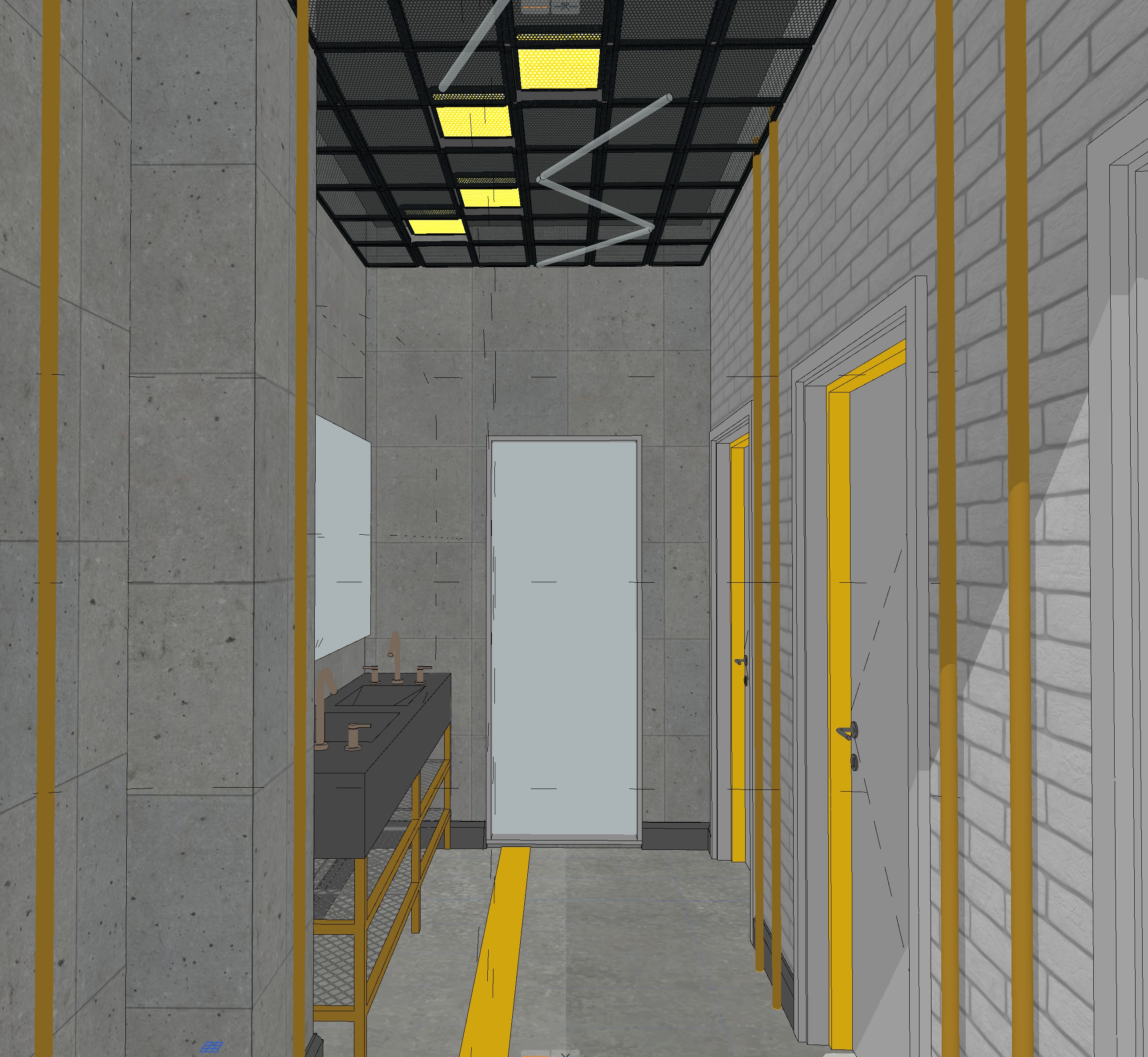 ultra realistic architectural interior render of an industrial style public bathroom corridor raw exposed concrete walls and structural surfaces with subtle imperfections and formwork texture on the right side a gray brick wall with a series of bathroom stall doors framed in bright industrial yellow metal vertical decorative exposed yellow pipes on the left side a heavy concrete wall and a concrete sink unit with exposed plumbing and a yellow metal support frame large rectangular mirrors above the sink with soft perimeter backlighting integrated behind the mirrors creating an indirect glow on the wall the ceiling is a black steel grid black metal mesh structure with integrated zig zag neon light tubes acting as the main lighting element some ceiling panels are slightly up made of yellow metal mesh structure lighting should feel slightly moody but functional typical of contemporary industrial interiors in the frame in the back is a mirror and reflecting a simple concrete wall the floor is polished concrete with a safety warning stripe running along the corridor yellow and black hazard striping painted on the floor style contemporary industrial architecture brutalist influences high realism materials rough concrete painted brick powder coated metal stainless steel fixtures safety yellow industrial paint lighting realistic global illumination soft indirect lighting from mirror backlights neon ceiling lights casting subtle reflections on concrete floor mood clean but raw industrial public restroom slightly cinematic architectural visualization quality