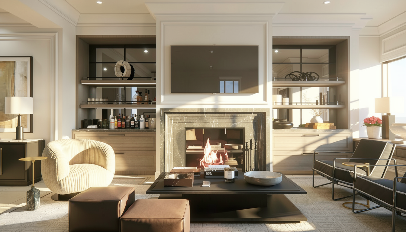 change the floor and put wood planks in a light beige wood finish add a lacquer finish to the white cabinetry make the lighting feel luxurious and serene