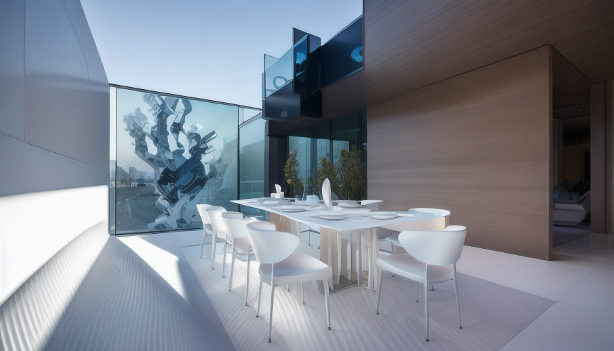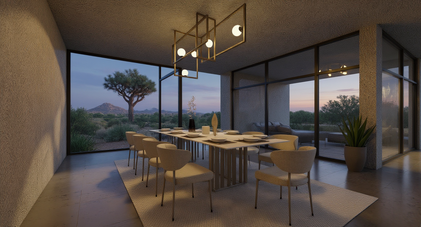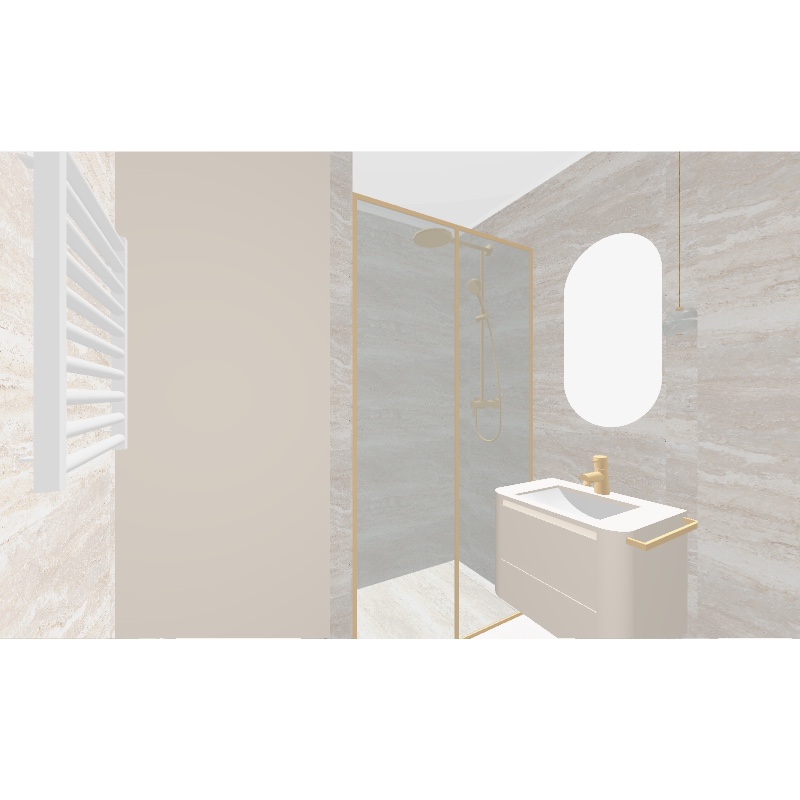 render a modern elegant bathroom interior with a soothing and minimalistic atmosphere use may murini silver travertino tile for the walls shower area and floor complemented by light creme basin unit and creme coloured built in invisible sliding storage door on the left illuminate the space with ambient light feature a sleek creme sink and vanity with subtle gold accents include a glass shower enclosure with thin gold trim and a rain shower head place a large unframed rounded rectangular mirror above the sink and a modern white towel radiator on the left wall place a small pendant tom dixon melt lamp hanging from the ceiling on the right side of the mirror ensure the overall ambiance is tranquil and refined focusing on simplicity and luxury