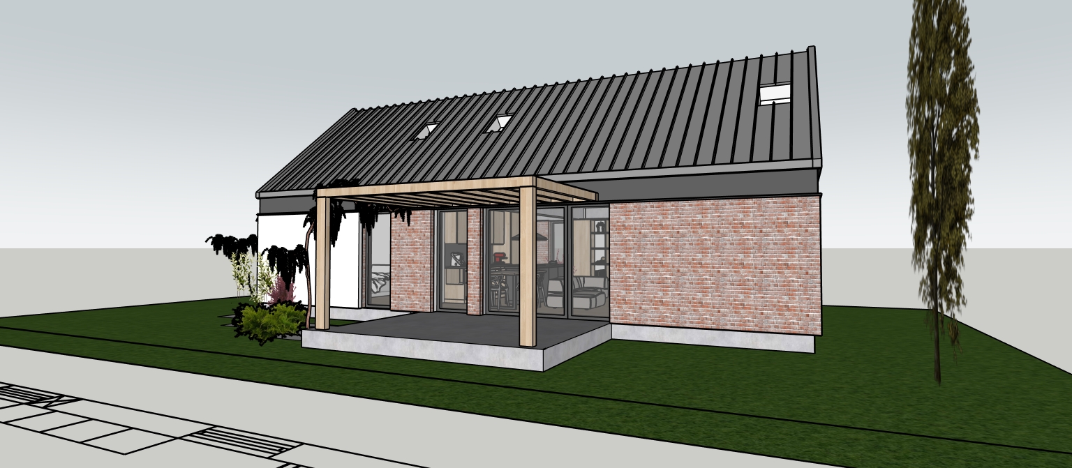 render a photorealistic 3d perspective of this house make a lush vegetation that looks native to the european area bushes and large trees nat cactus or suculents plant do not change the view only enhance the materials vibrant clear sky with light atmospheric depth keep materials as are in the picture but detail and make much better the texture groundfloor walls white plaster old brick a separation between groundfloor and firstfloor metallic beam dark gray roof seam metal roofing window reflecting sourranded area alley to the house cement rectangle terrace cement platform