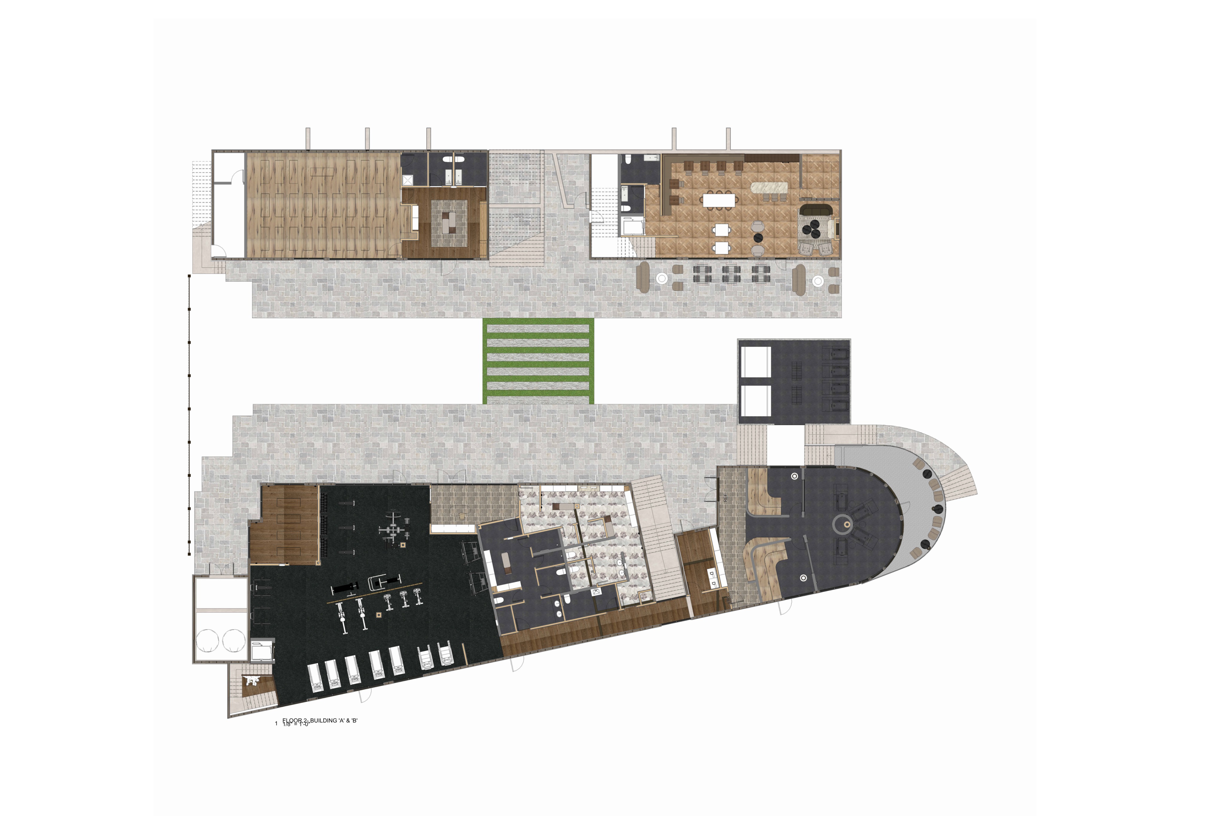 enhance this architectural floor plan render while preserving all original materials colors and layout exactly as shown do not change finishes textures or color palette improve lighting realism by adding soft natural shadows ambient occlusion and subtle depth increase clarity contrast and material definition while maintaining the existing design add realistic shading gentle directional light and slight highlights to create depth without altering the original tones keep a clean professional architectural visualization style