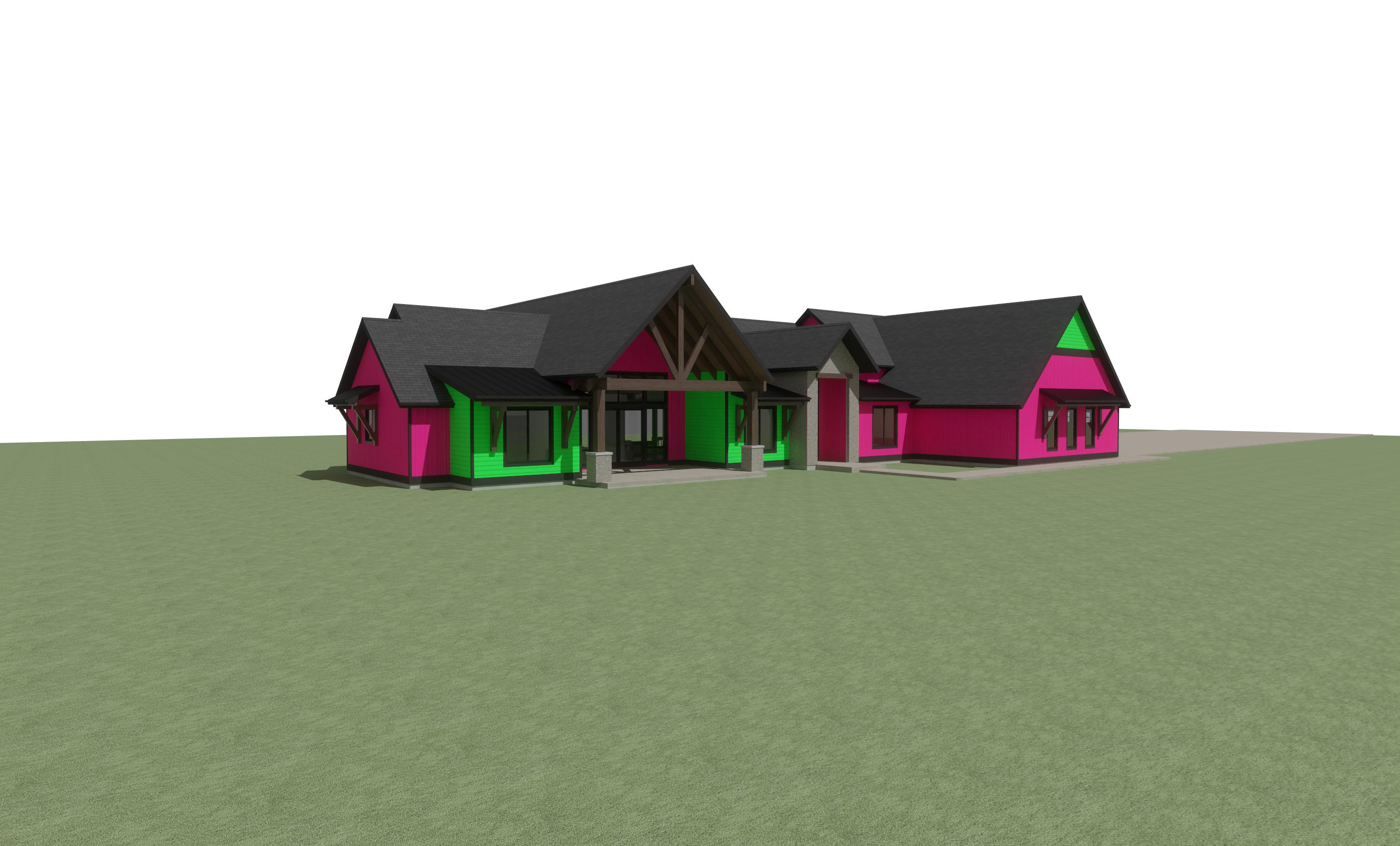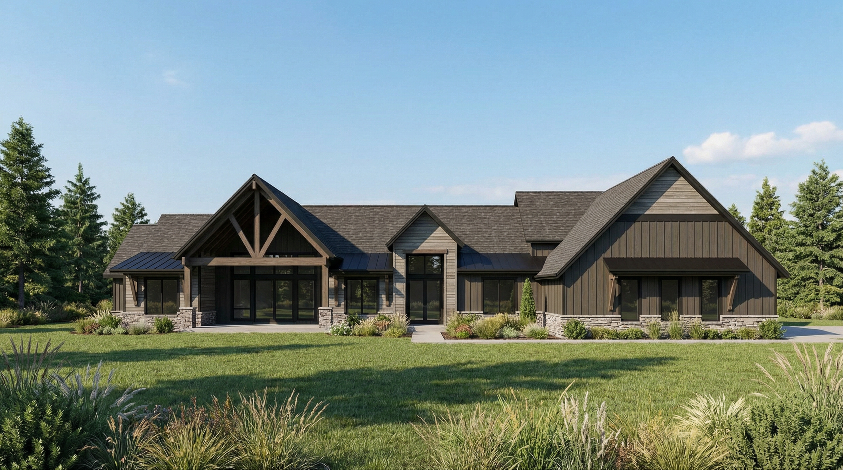 enhance the realism of the existing architectural design while maintaining the same materials and textures focus on realistic lighting shadows and surface details to create a lifelike appearance ensure the mixture of wood siding is preserved in the correct areas making them look authentic and cohesive so keep the horizontal siding and vertical siding the same as reference photo but change texture and color this is in montana add montana landscape but nice landscaping near the house add montana vegetation around house strict mode preserve all geometry exactly no design changes siding material critical pink board and batten make texture with tight linear wood grain striations not smooth not flat pronounced horizontal grain pattern color rgb 64 57 48 do not replace with cedar reclaimed wood or generic wood textures do not change color tone warmer or darker siding material critical green lap siding make texture with tight linear wood grain striations not smooth not flat pronounced horizontal grain pattern make the color cool gray brown with subtle variation slightly weathered tone here is the rbg for the lighter color rgb 211 202 192 here is the rbg for the darker color rgb 79 71 62 grain should appear compressed and consistent not wide or rustic do not replace with cedar reclaimed wood or generic wood textures do not change color tone warmer or darker make all trim around doors and windows trim at bottom of house and fascia diamond kote onyx color material lock all siding areas must remain siding do not change material locations or boundaries render photorealistic material detail with accurate grain scale and depth material lock all siding areas must remain siding do not change material locations or boundaries do not add materials do not add rock to walls just show the rock thats there in the reference photo render photorealistic material detail with accurate grain scale and depth make rock shown look like a stacked mountain modern style rock