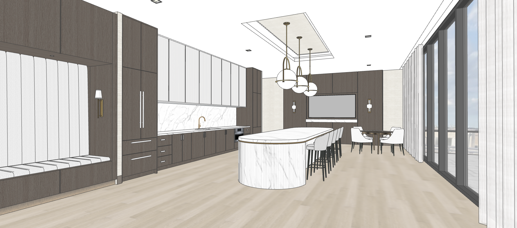 luxurious kitchen interior with calcatta stone backsplash and fluted curved calcatta kitchen island