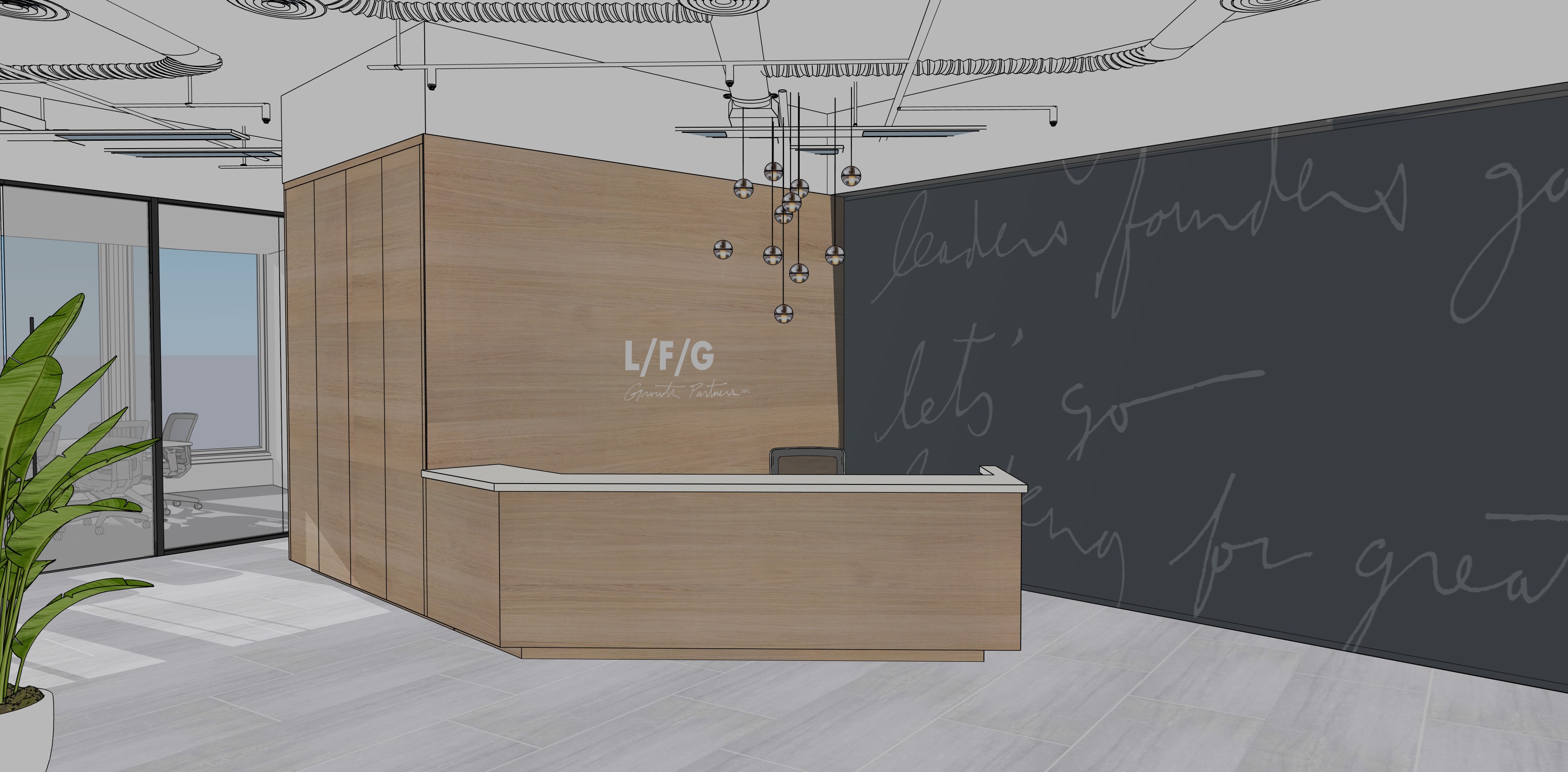 white oak wood brass l f g logo semi transparent dark wall white countertop close city background light grey tile like in image white walls above