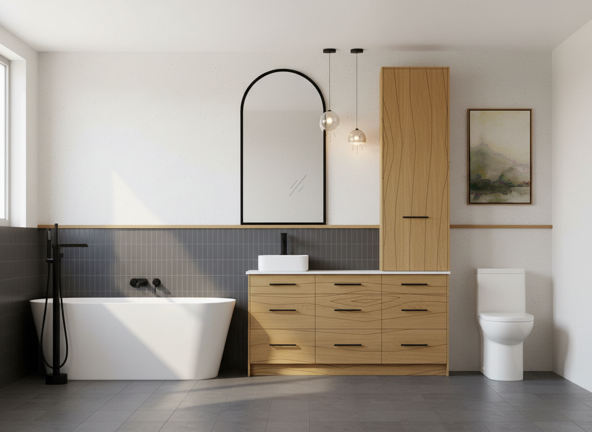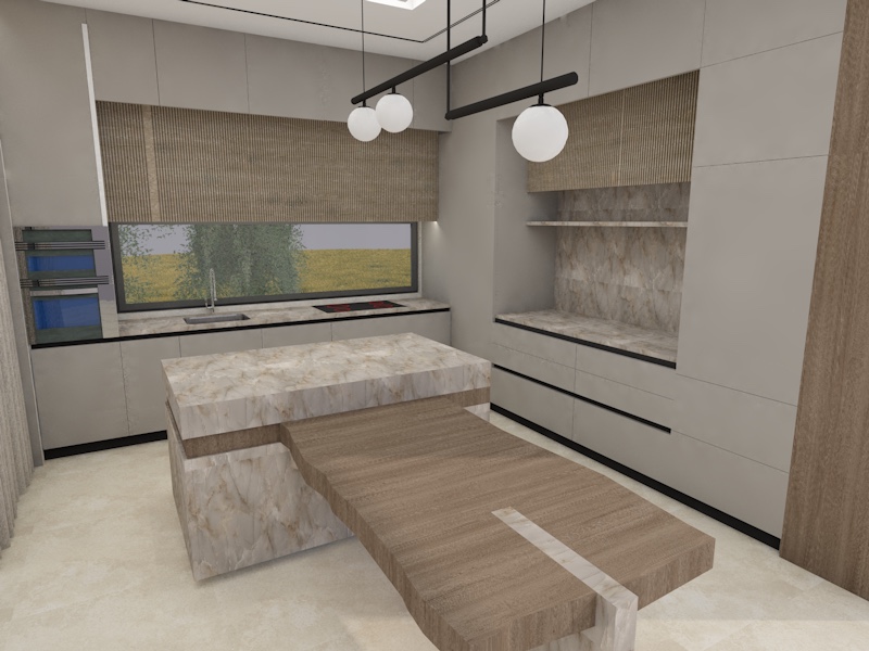 keep ral 9016 gloss boards where you see the light color above the sink i want wooden boards whit vertical 3d lines where the brown boards are glossy marble counters beige tiles on the floor 60x120 hidden light unter the above cupboards and keep the black details unter the boards between the drawers and unter the boards and above the floor the higher white boards above the sink are in the same position with the boards of the oven and the wooden boards are having a smaller lenght add decor