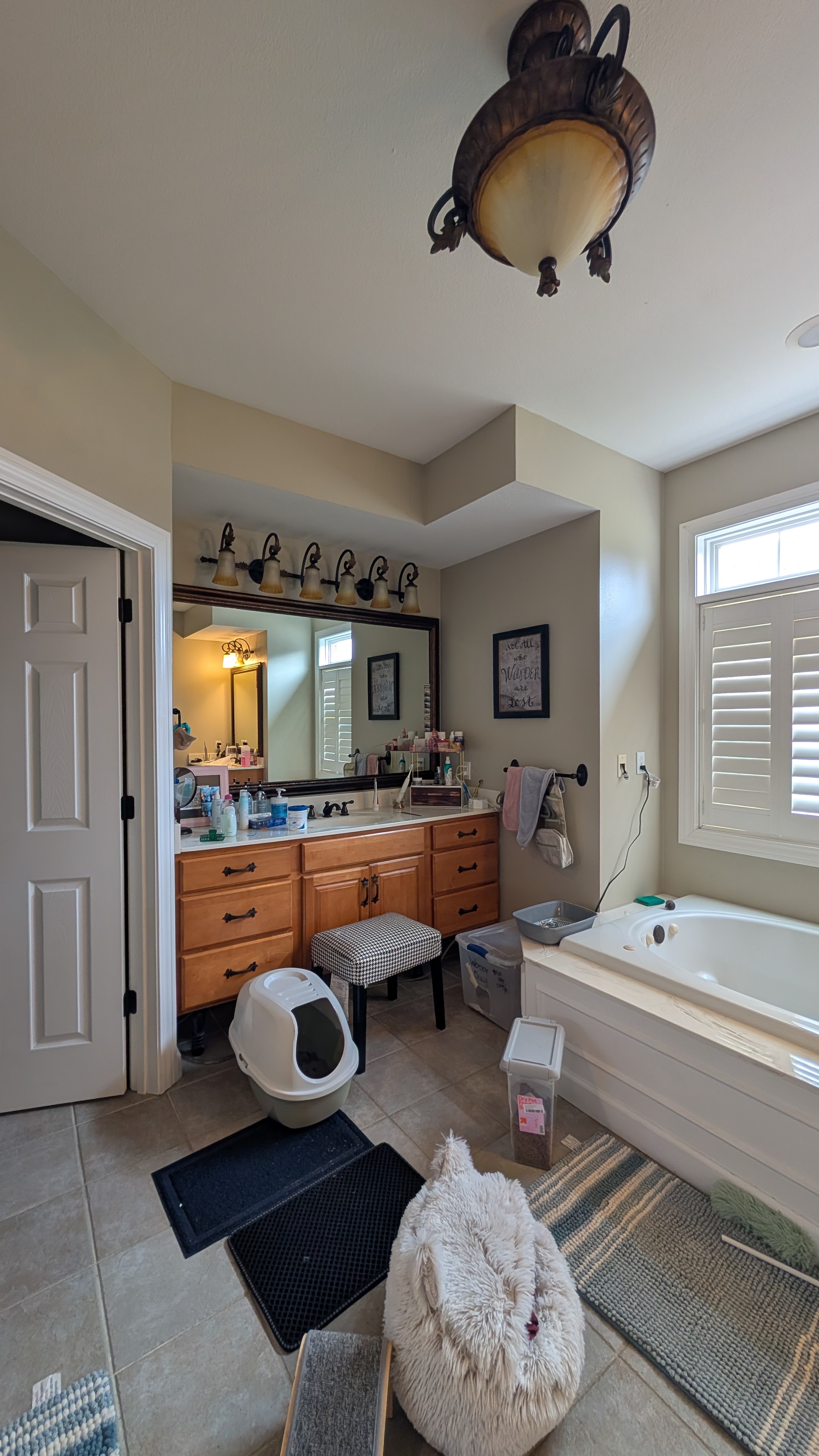 remove clutter soft black vanity paint paint walls rich blue blush pink towels soft gold faucets fixtures and mirrors keep tile flooring keep tub