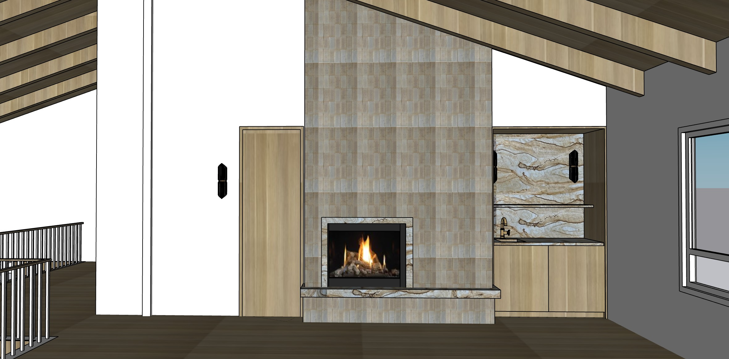 create photorealistic rendering with ocean view out west window only make tile colors more realistic remove repeating large rectangle pattern keep colors of tile and slab closer to image