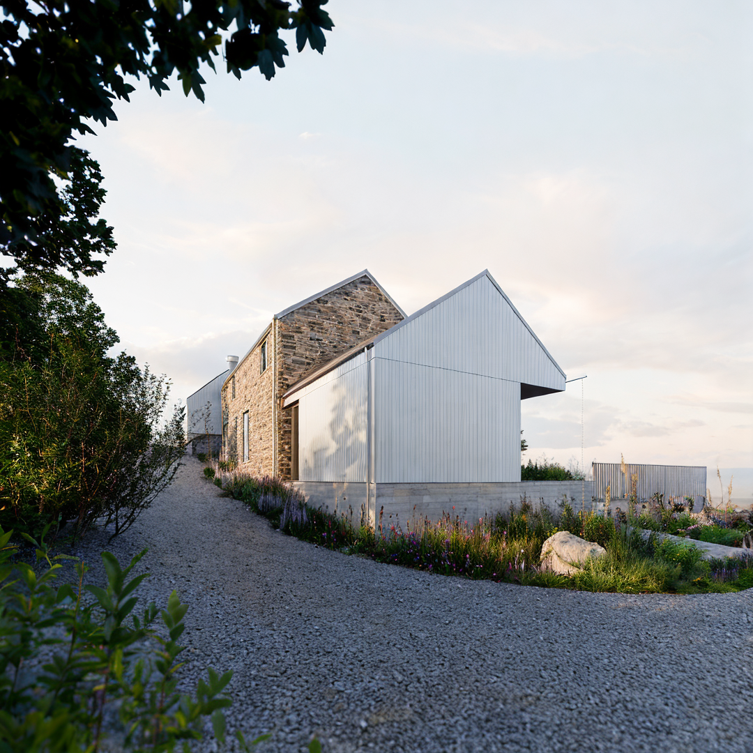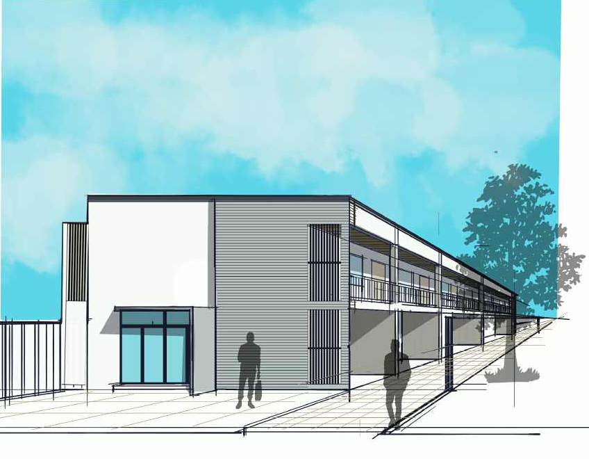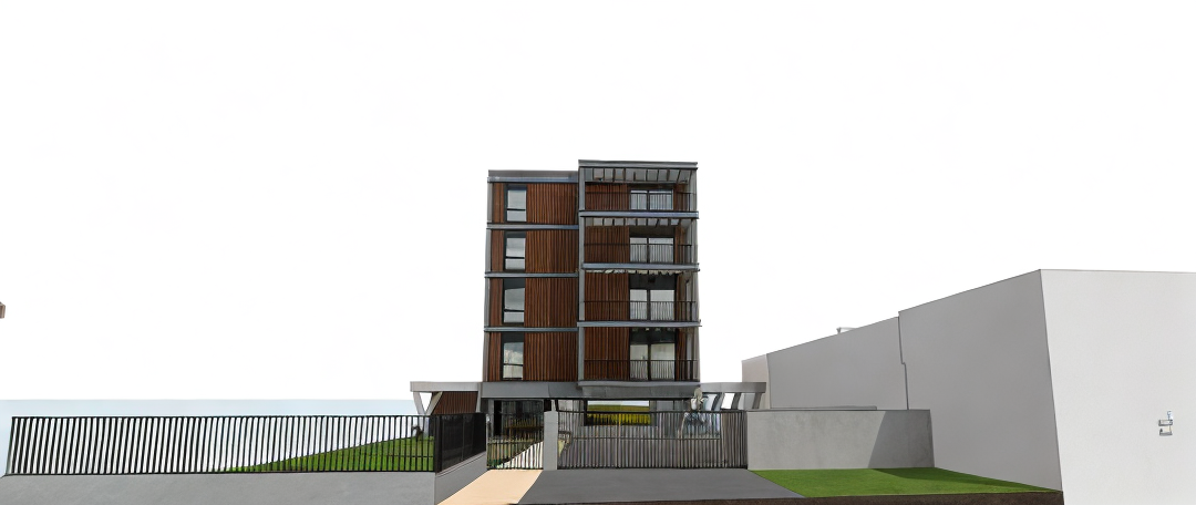ultra realistic 3d render of a modern two story apartment with floor to ceiling glass windows flat concrete roof and wood panel ceiling commercial space laundry area in front parking area in front of the structure rendered in cinematic lighting with soft shadows high detail textures 8k resolution architectural visualization style