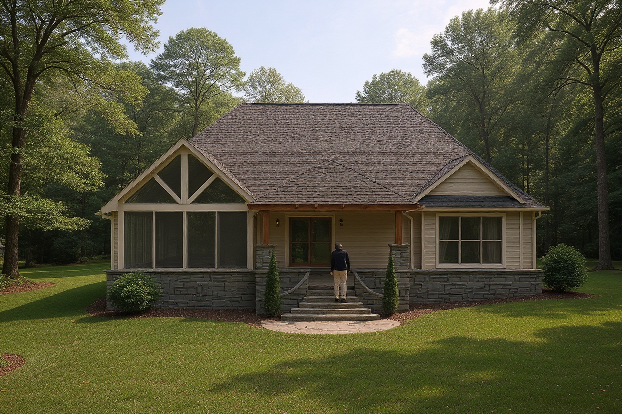victorian exterior shot retreat nestled in cozy autumnal forest with spectacular views of snowcapped mountains architecture