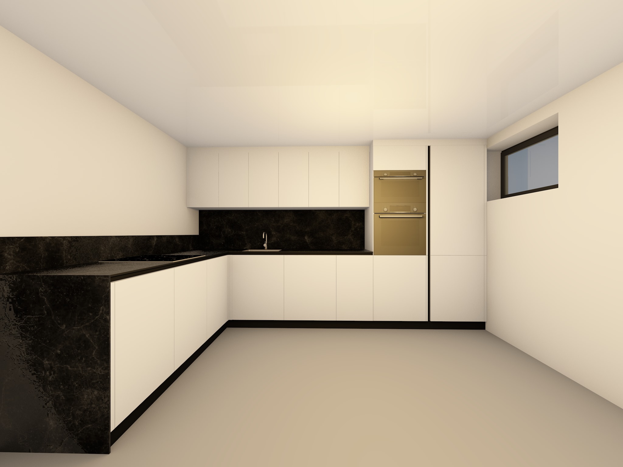 modern minimalist kitchen soft white black footing electric cooktop gray 60x60 tiles floor matt marble compact add kitchen accessories