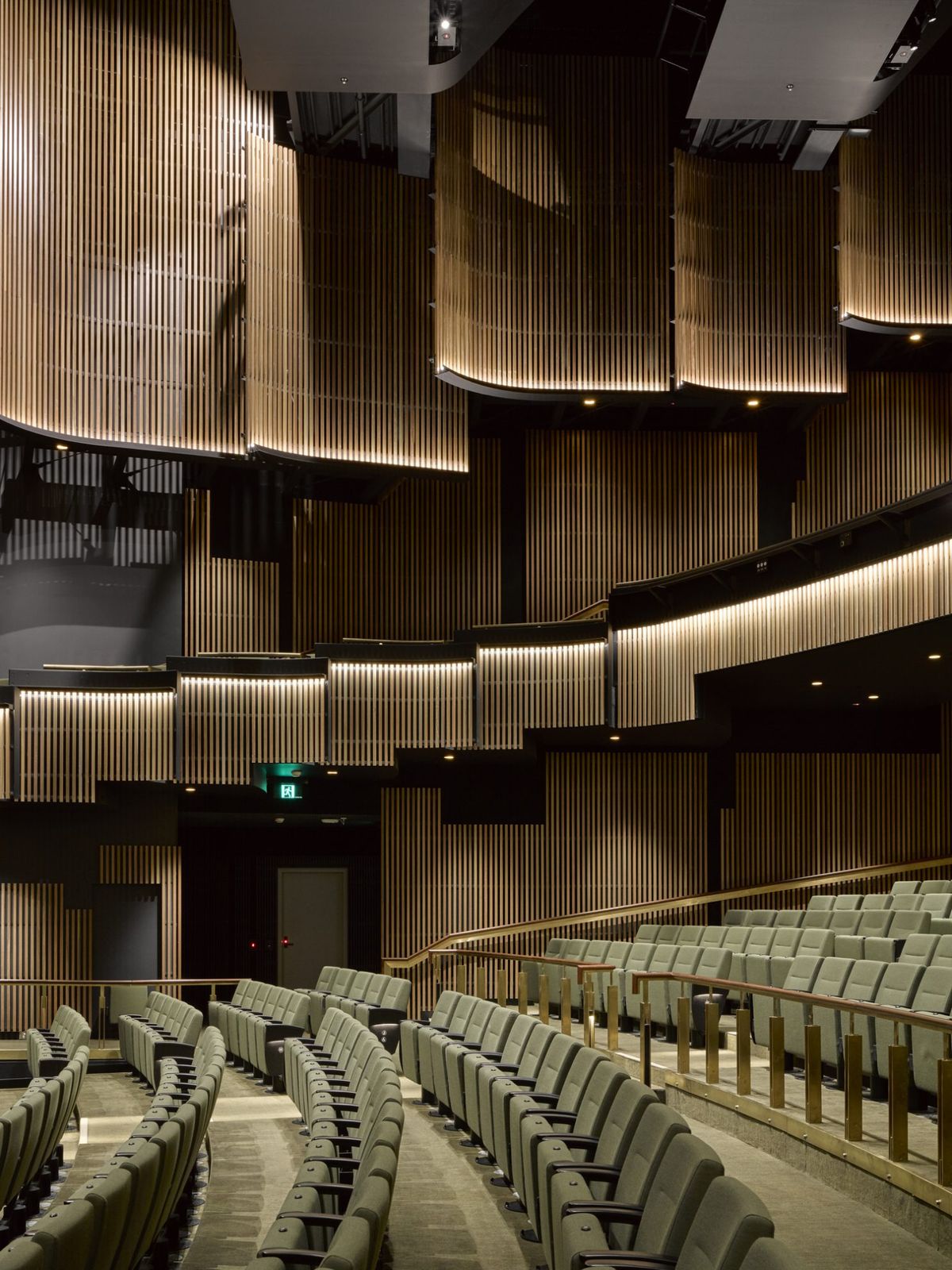 exterior shot auditorium interior led light from vertical panel edges black ceiling with spotlights