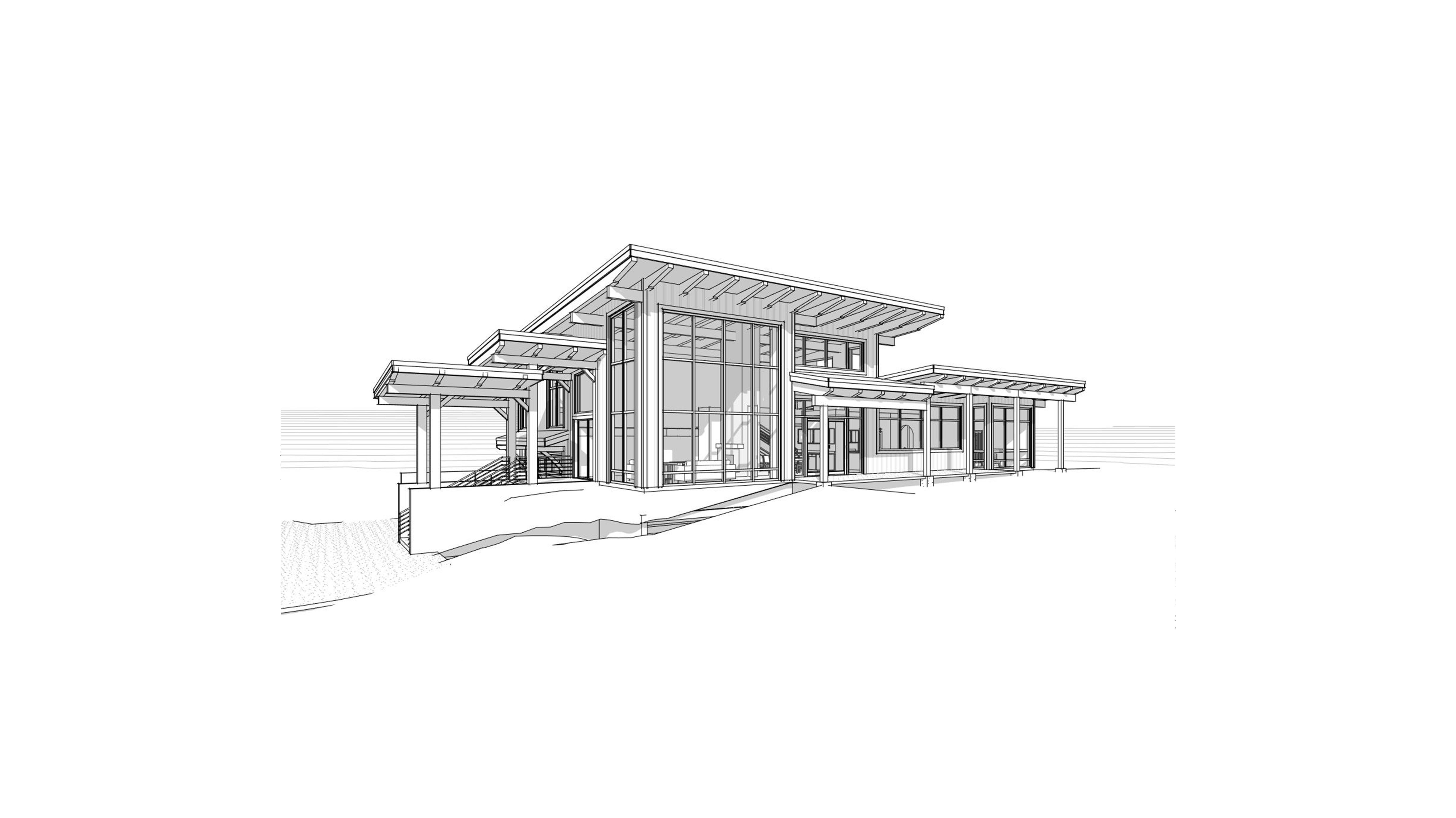 back view of a clean modern architectural exterior home rendered in cinematic vibrant golden hour lighting home in a winery setting with streaks of light coming through trees in the surrounding area warm glow and reflections off of the windows blue sky shining rustic select grade vertical wood siding green manicured landscape around structure with gardens and patches of grass black standing seam metal roof prominent trees and winery in the background high fidelity photorealistic visualization crisp shadow falloff refined facade geometry soft atmospheric depth premium architectural photography mood ultra clean composition and materials black window trim flat roof photorealistic render
