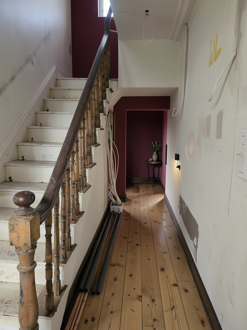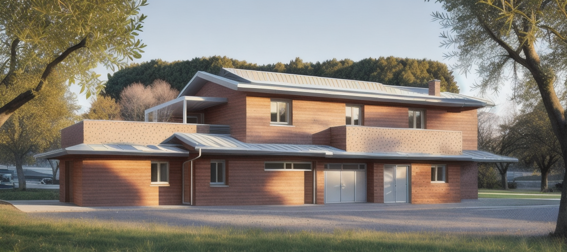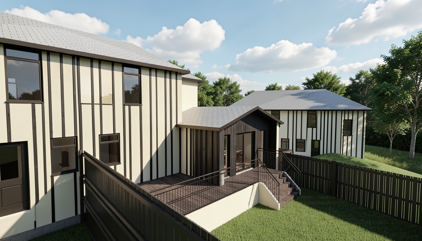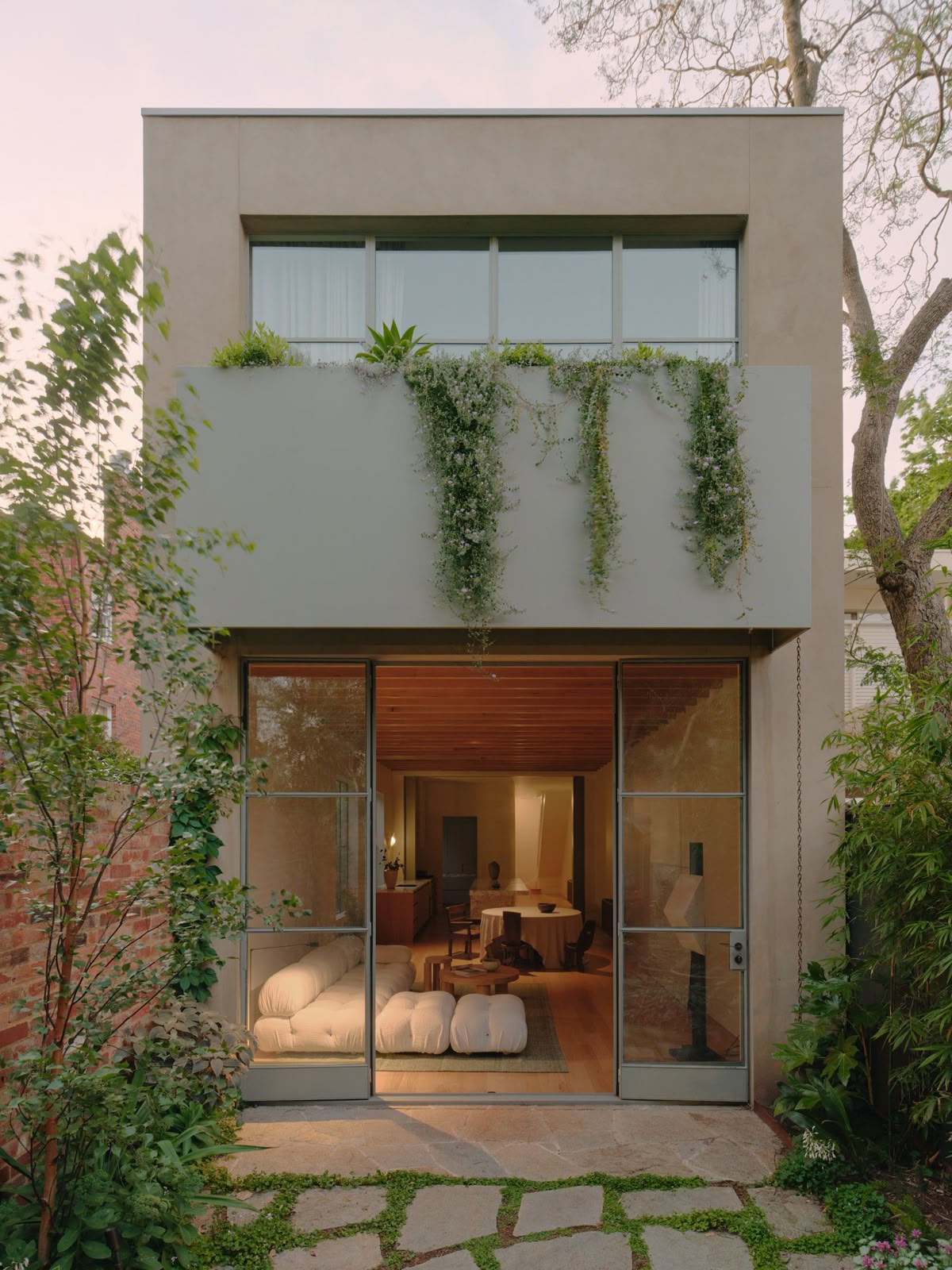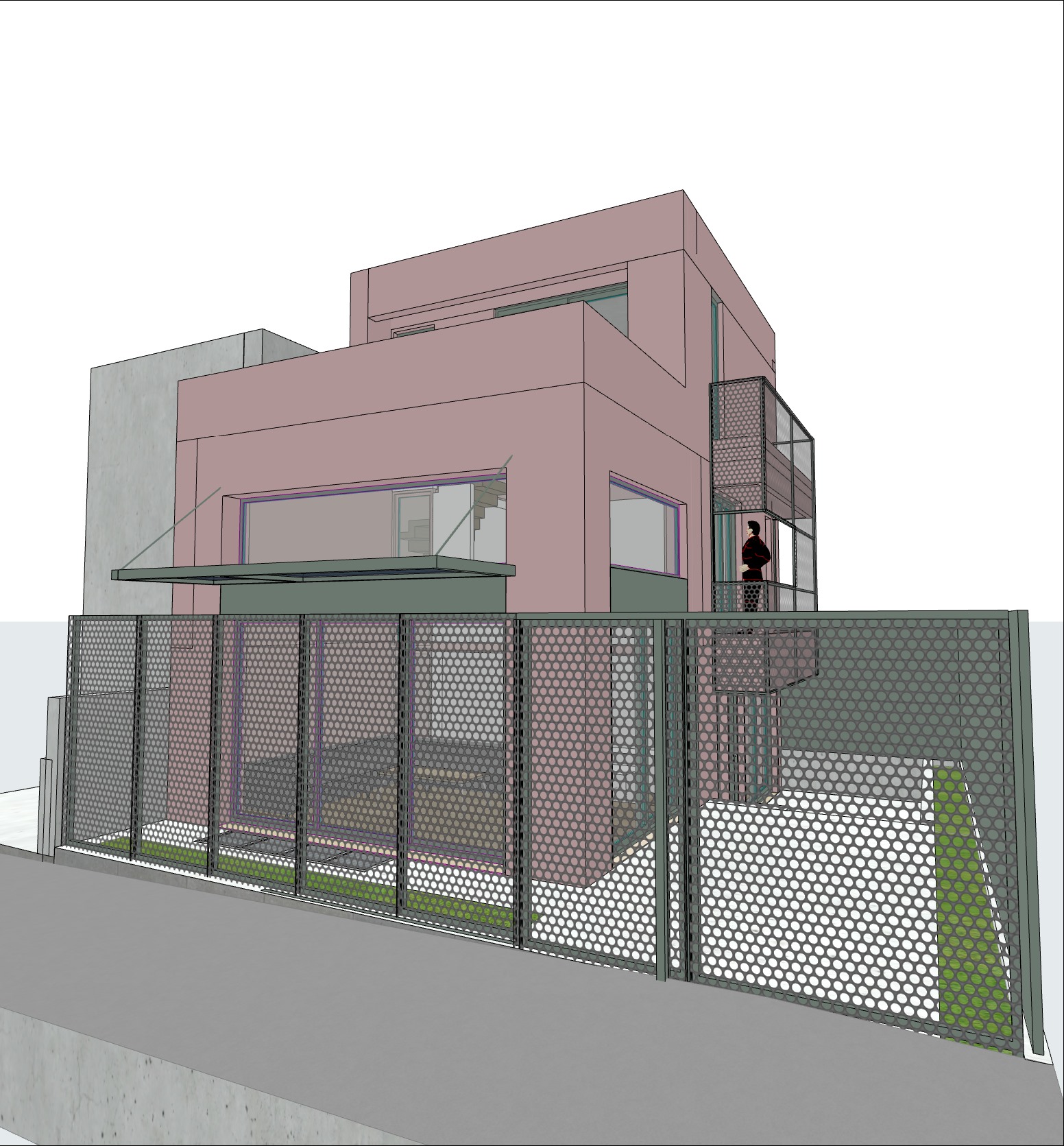 exterior shot urban house with exterior plaster on earthy colors pink and green earthy windows green in the small courtyard and on the terace above