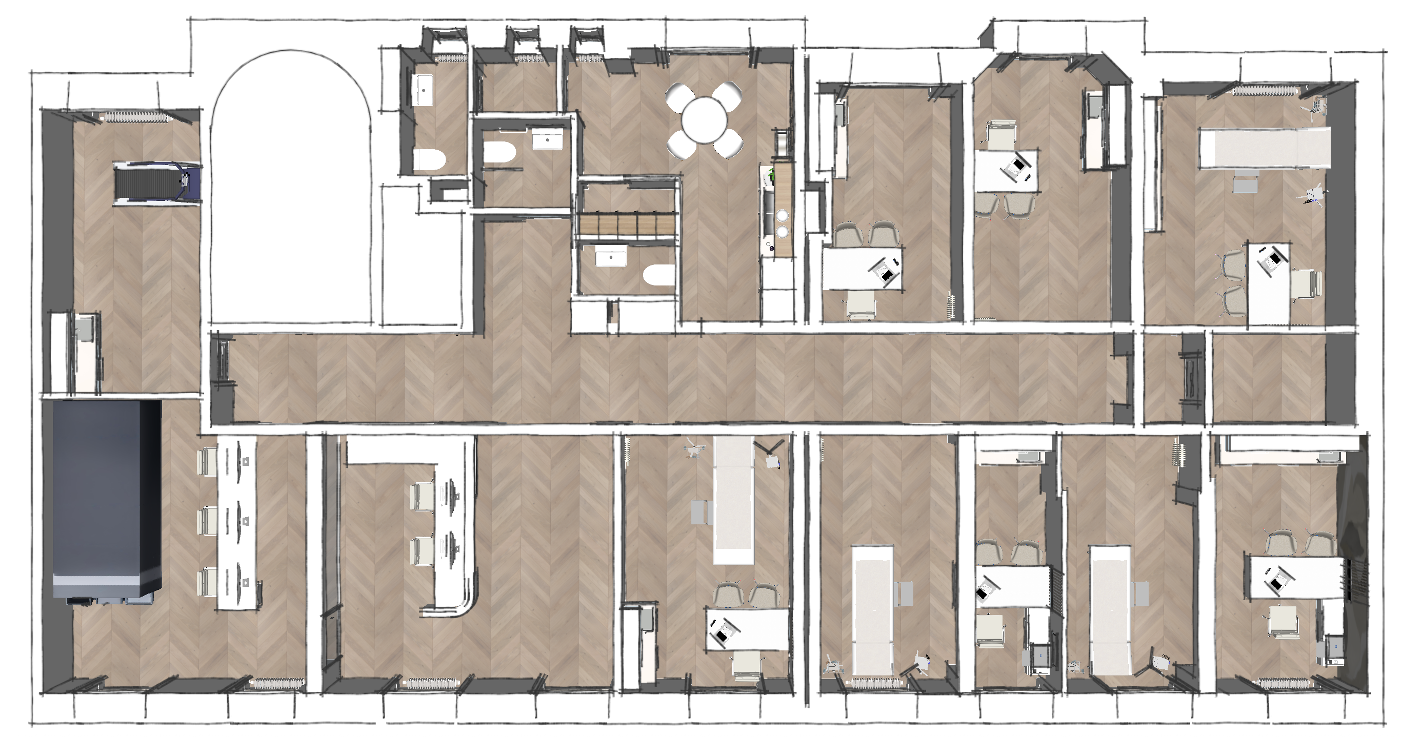 preserve the exact original layout maintain identical floorplan positions room sizes doors windows and furniture placement only hand rendered soft watercolor textures subtle shadows muted natural tones interior design presentation illustration clean top down view artistic but precise architectural rendering lightweight sketch style