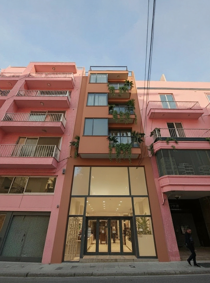 change the colour of the central facade only to terracotta e863 by antologia a warm pinkish clay tone with subtle earthy undertones make it as dark as possible apply this as a realistic matte plaster finish with a natural sun baked appearance the tone should be soft warm and visually appealing balanced between pink and burnt clay ensure the soffits undersides of the balconies are finished in the same terracotta e863 colour as the rest of the central facade for a cohesive and uniform look keep surrounding buildings pavements and the dark grey apertures unchanged and maintain the same lighting shadows and camera angle for a photo realistic result