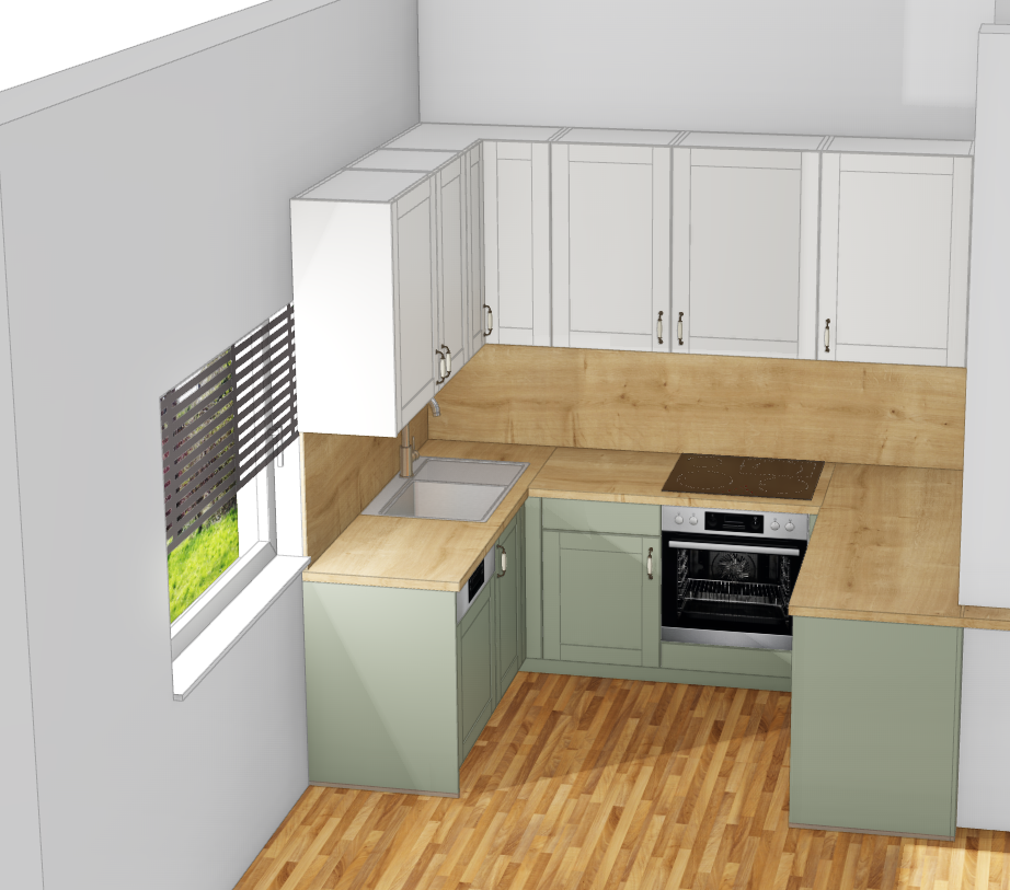 exterior shot render a beautifully designed modern kitchen with light sage green lower cabinets and soft ivory upper cabinets the countertops and backsplash are a warm oak wood texture include a sleek stainless steel oven and a contemporary metallic sink the floor is a rich warm wood tone add a window with horizontal blinds slightly open to reveal lush greenery outside allowing natural light to flood the room with a cozy and inviting atmosphere the overall ambiance is bright and welcoming combining natural elements with modern elegance