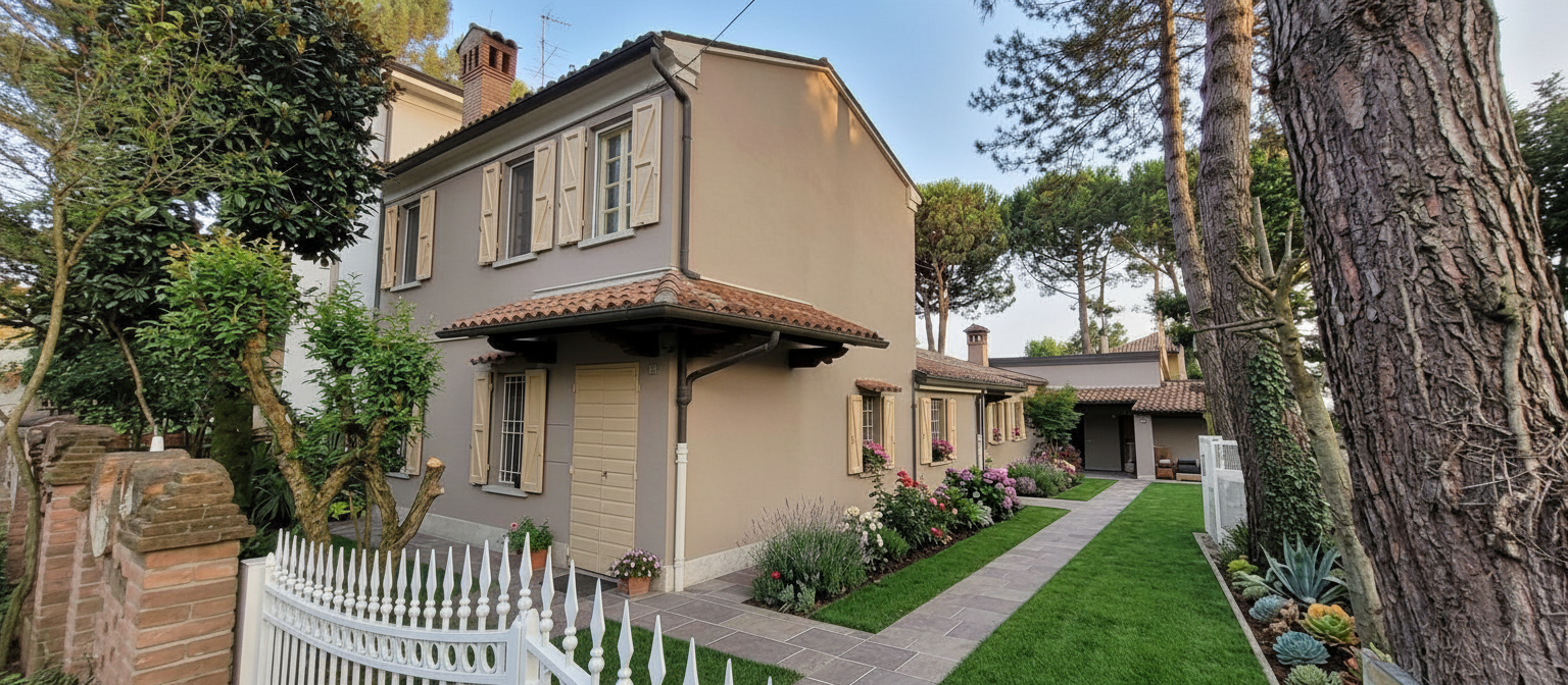 fai uno scenario notturno aggiungendo dei corpi illuminanti nel giardino con creazione di luci a spo diffuse in un gioco di luce e ombra ed evidenziando le facciate della casa con strip led e qualche faretto