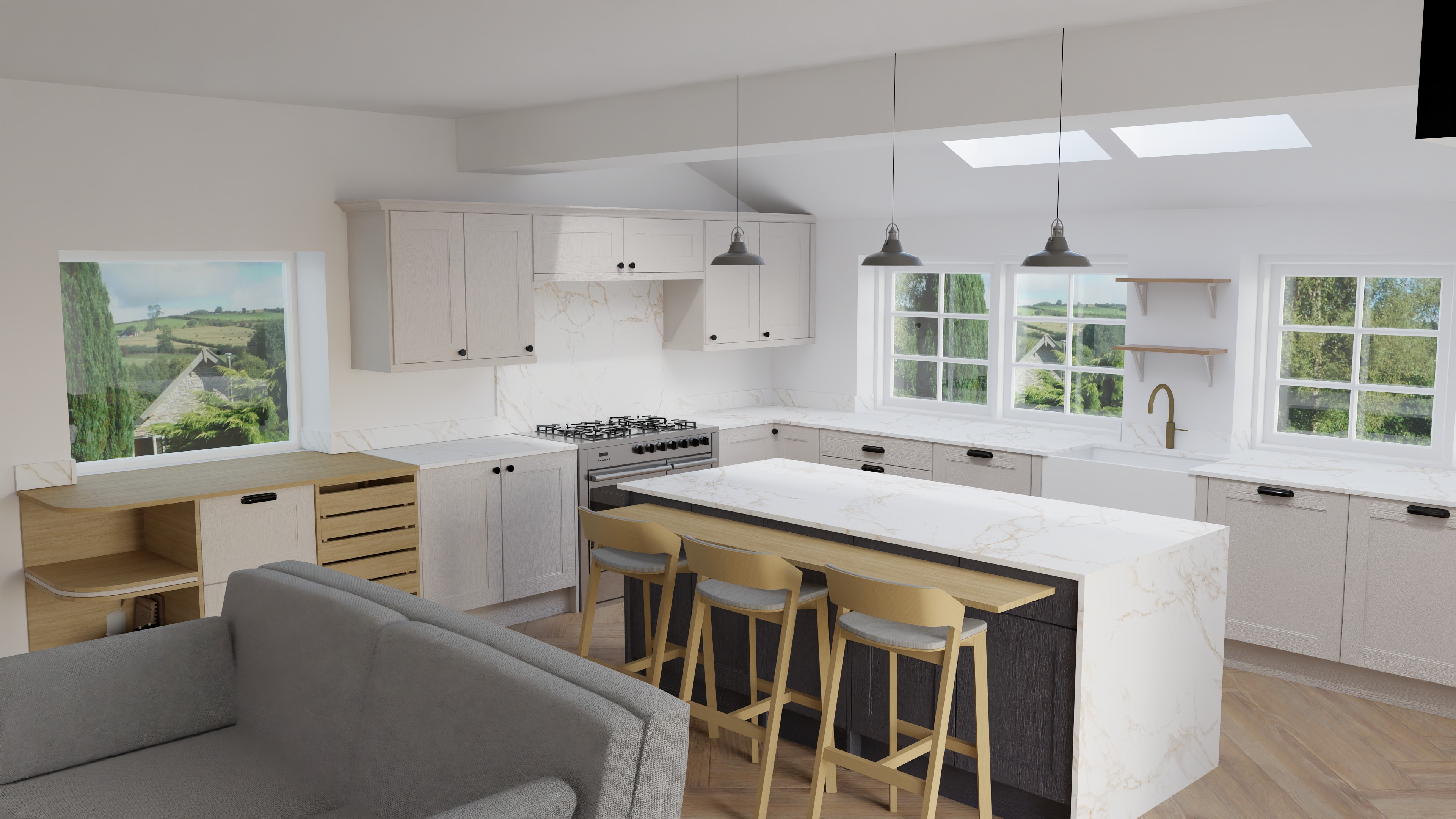 dress shelves above sink peace lily on island top lighting under wall units and a chopping board with vegetables on the island comfy cushions on the sofa