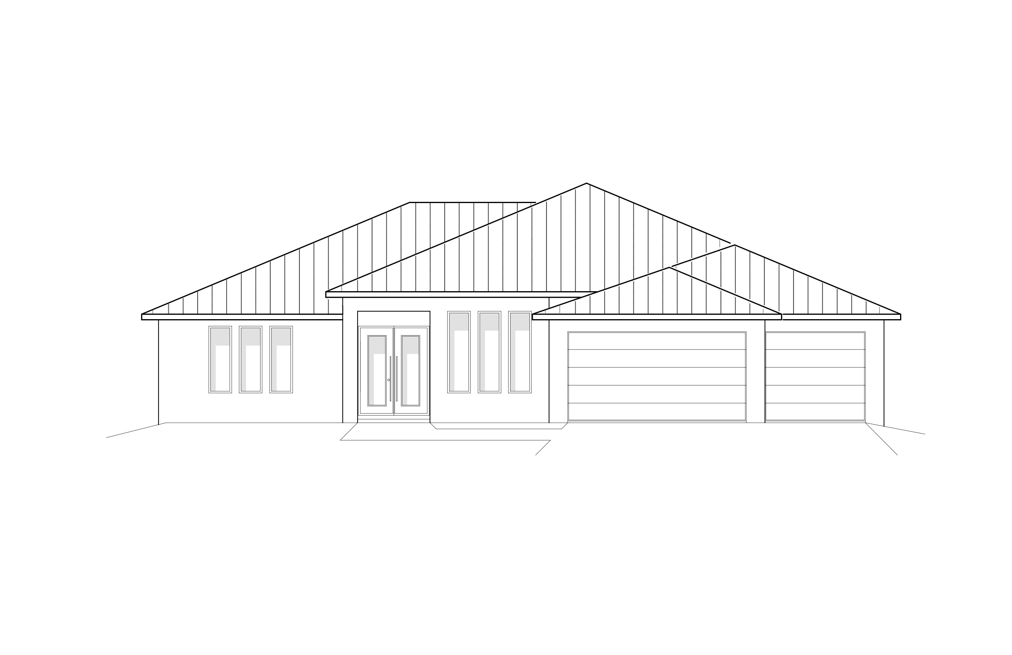 dark gray standing seam metal roof white fascia white soffit white frame windows dark gray entry door dark garage large and small garage door tropical landscaping grass yard large dappled gray paver driveway to edge of road paver walkway to entry white walls small garage is 2 feet behind large garage 3 windows to the left of large garage door are 84 behind large garage door entry column is 4 in front of wall with 3 windows to the left