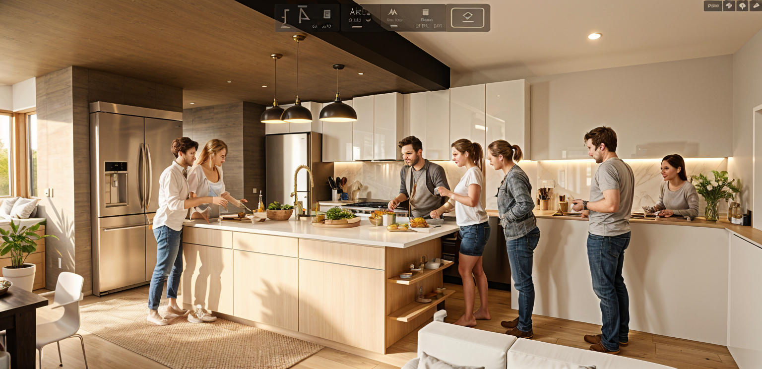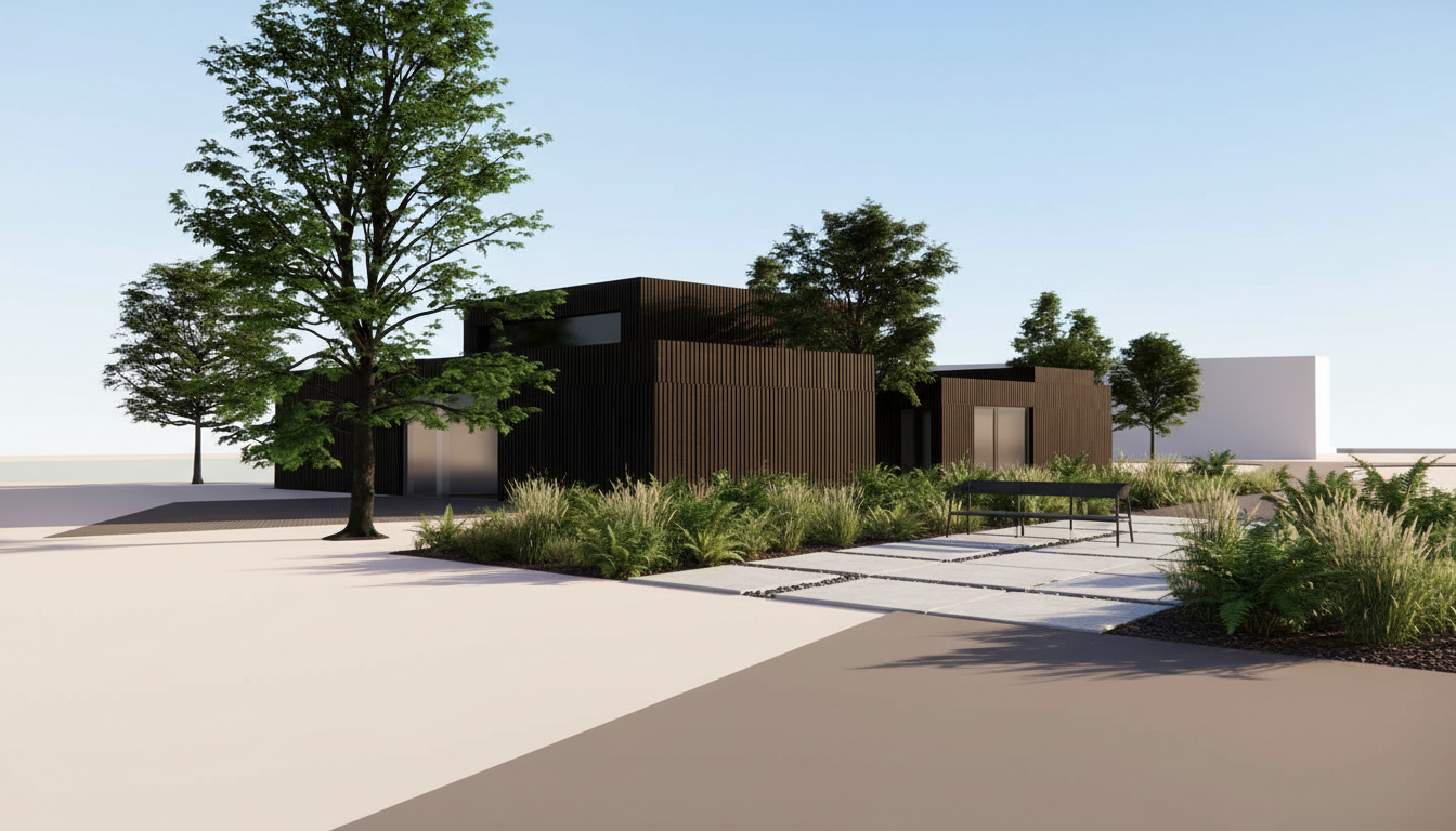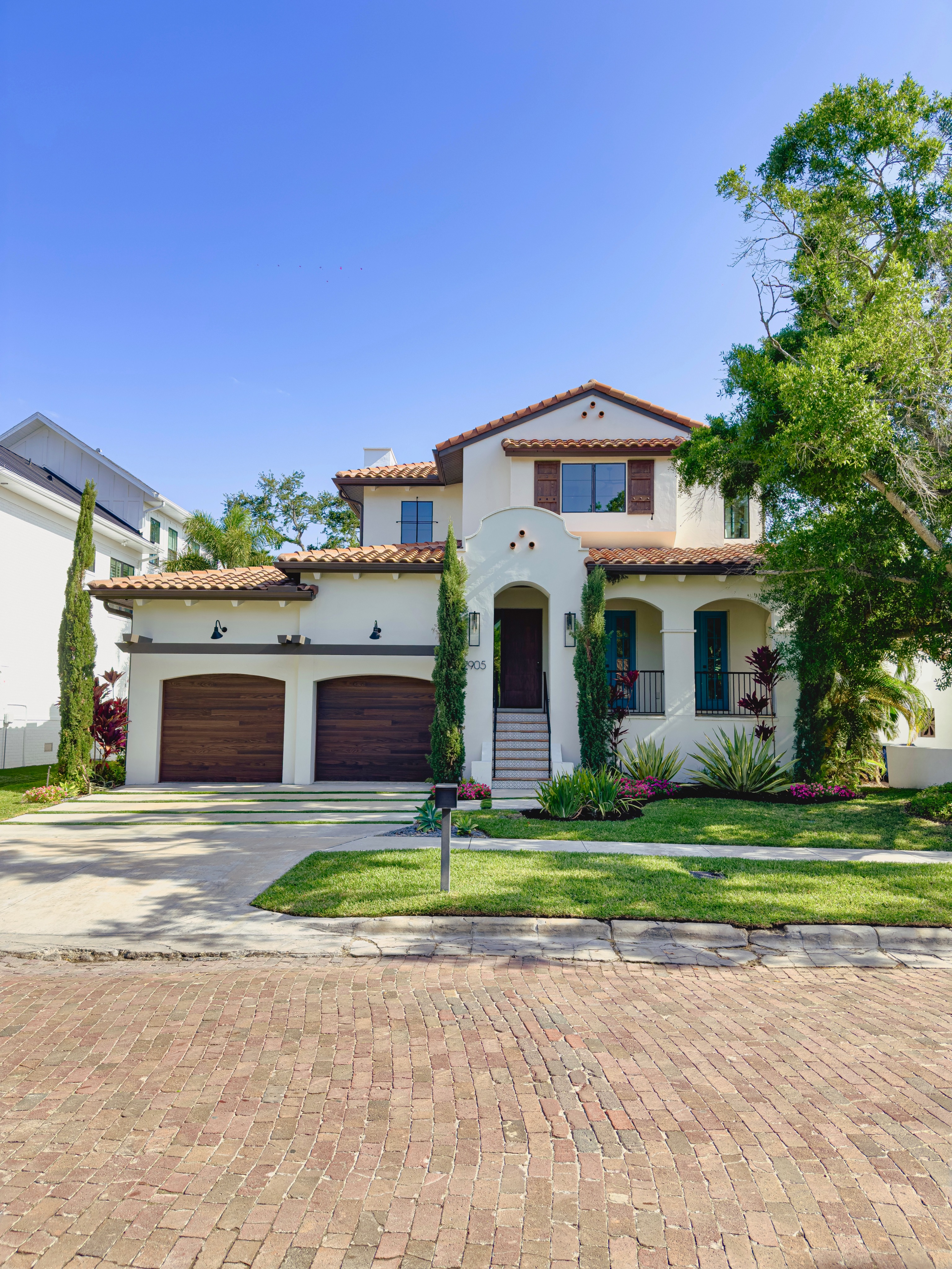 do not modify any of the building or greenery however add a pink bougainvillea growing along the left side of the trellis above the garage doors