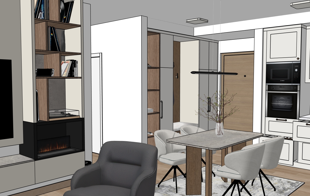 make photo realistic with natural light from left down corner only and use artificial light in halls