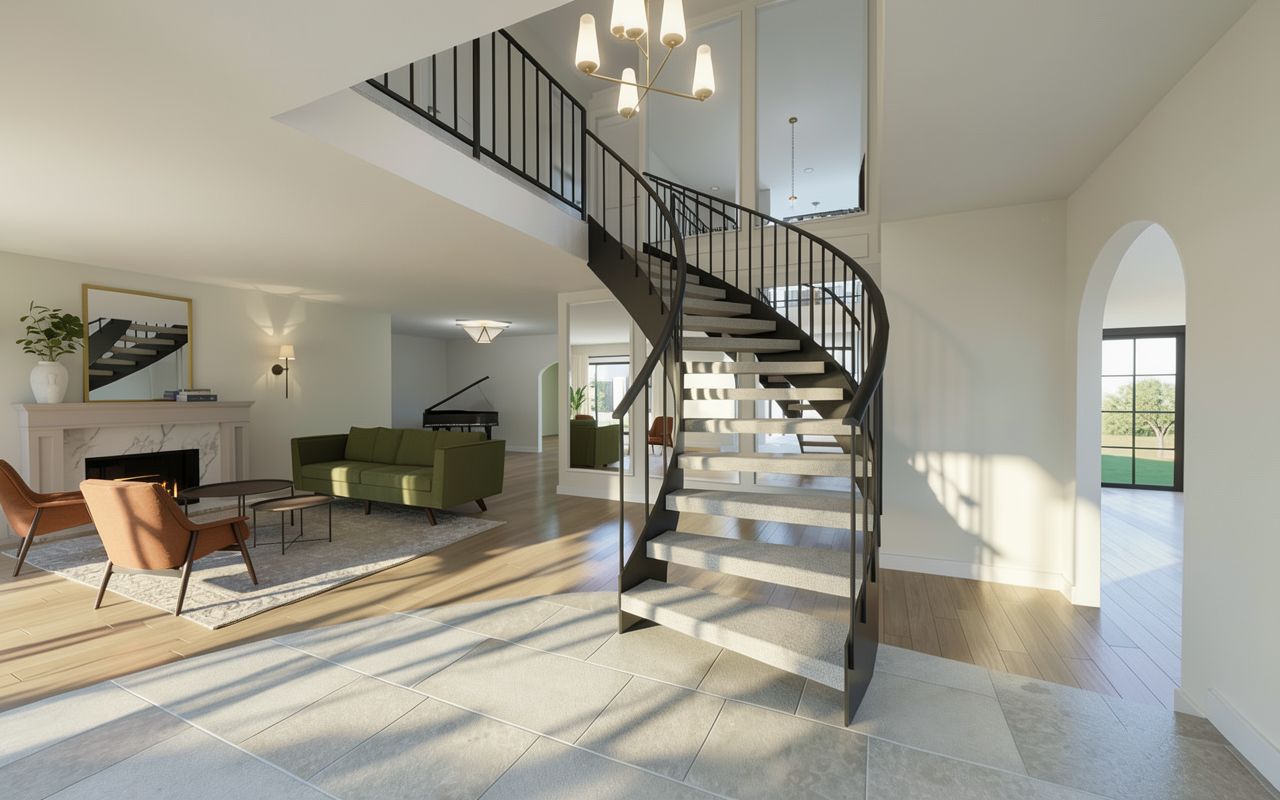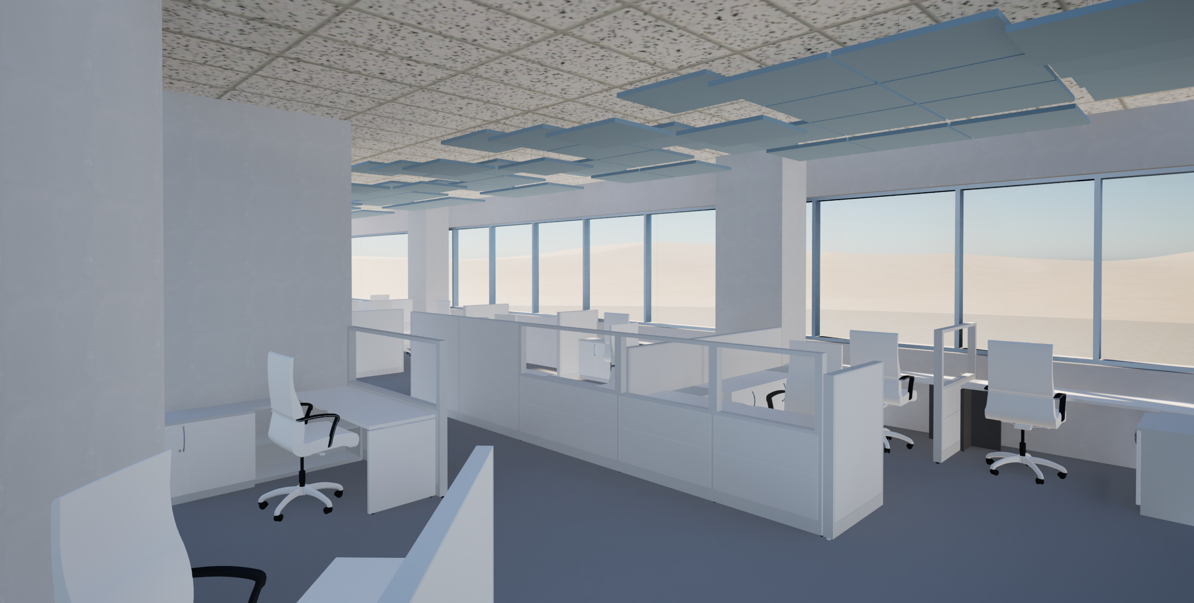 minimalism perspective shot this is my studio office project that i need to render the ceiling should be a dark grey or black the ceiling tiles that are suspended make a very very dark blue all the walls make a greyish blue colour the curtain walls leave clear so i can see through to the offices all the furniture make a beige colour the floors should be a darker wood colour while the tables are more of an oak material on the right bottom of the picture is a office cubicle divider just render that in a bit of a darker white and give it some texture do not change anything about the layout architecture