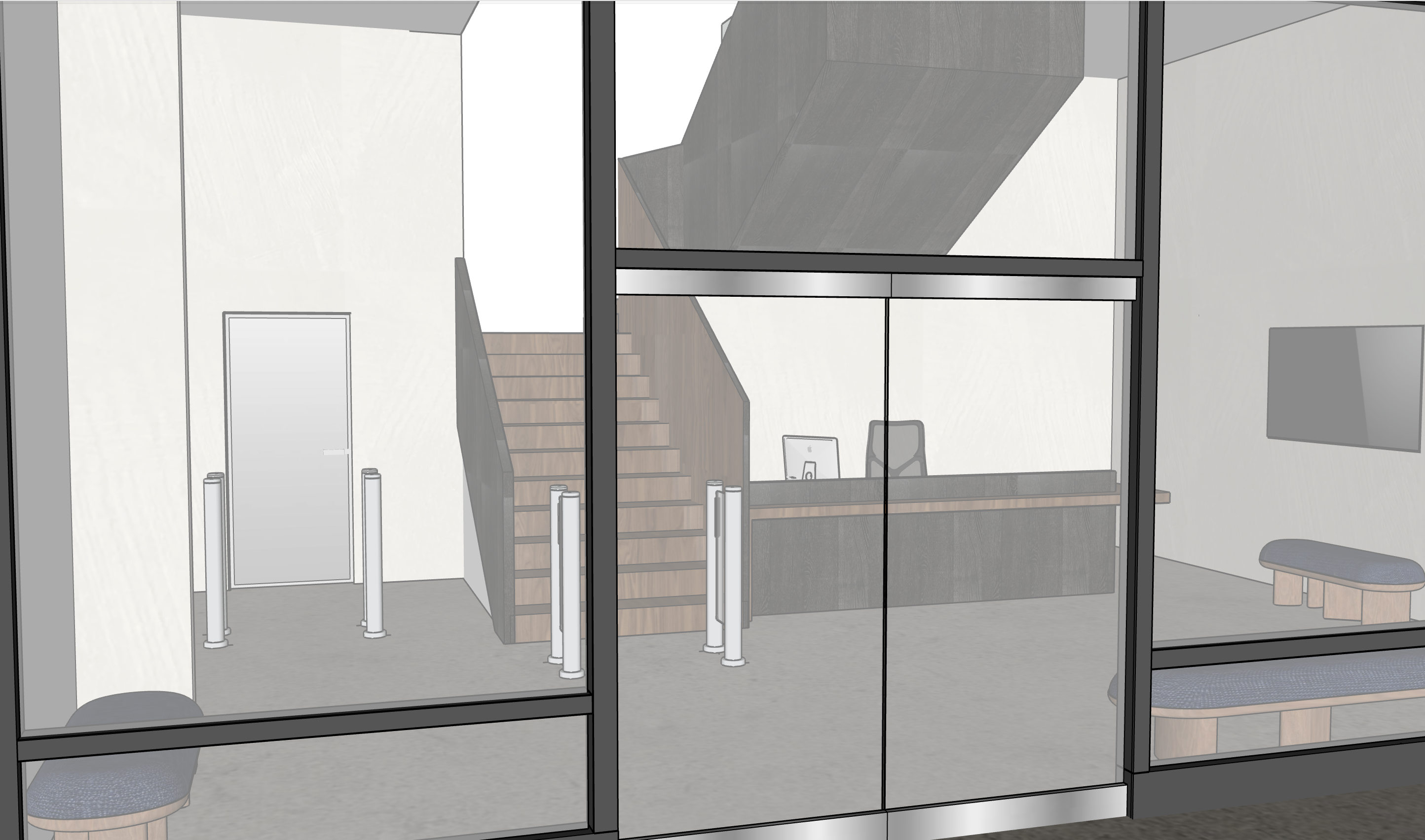 maintain colors and materials in the model make glass frames stainless steel make door in the back opaque glass please make the lighting soft bright even and warm keep the stair and reception desk finishes as they are in the image