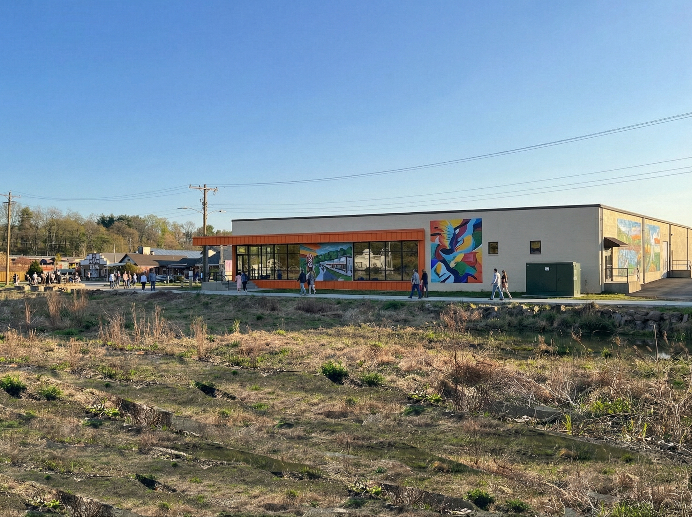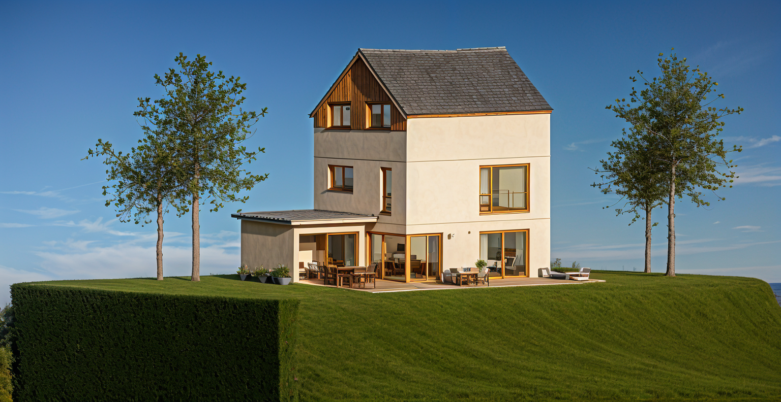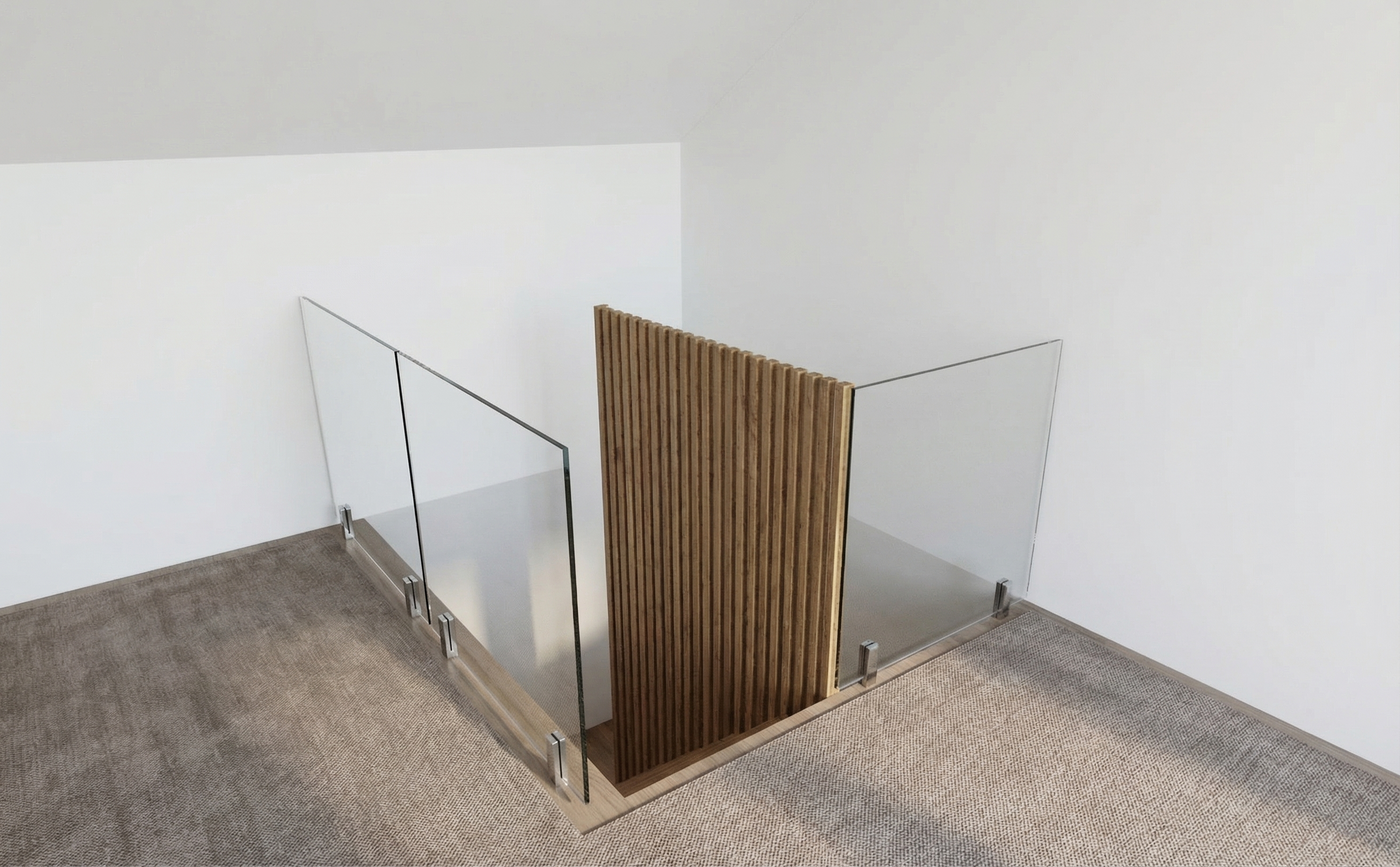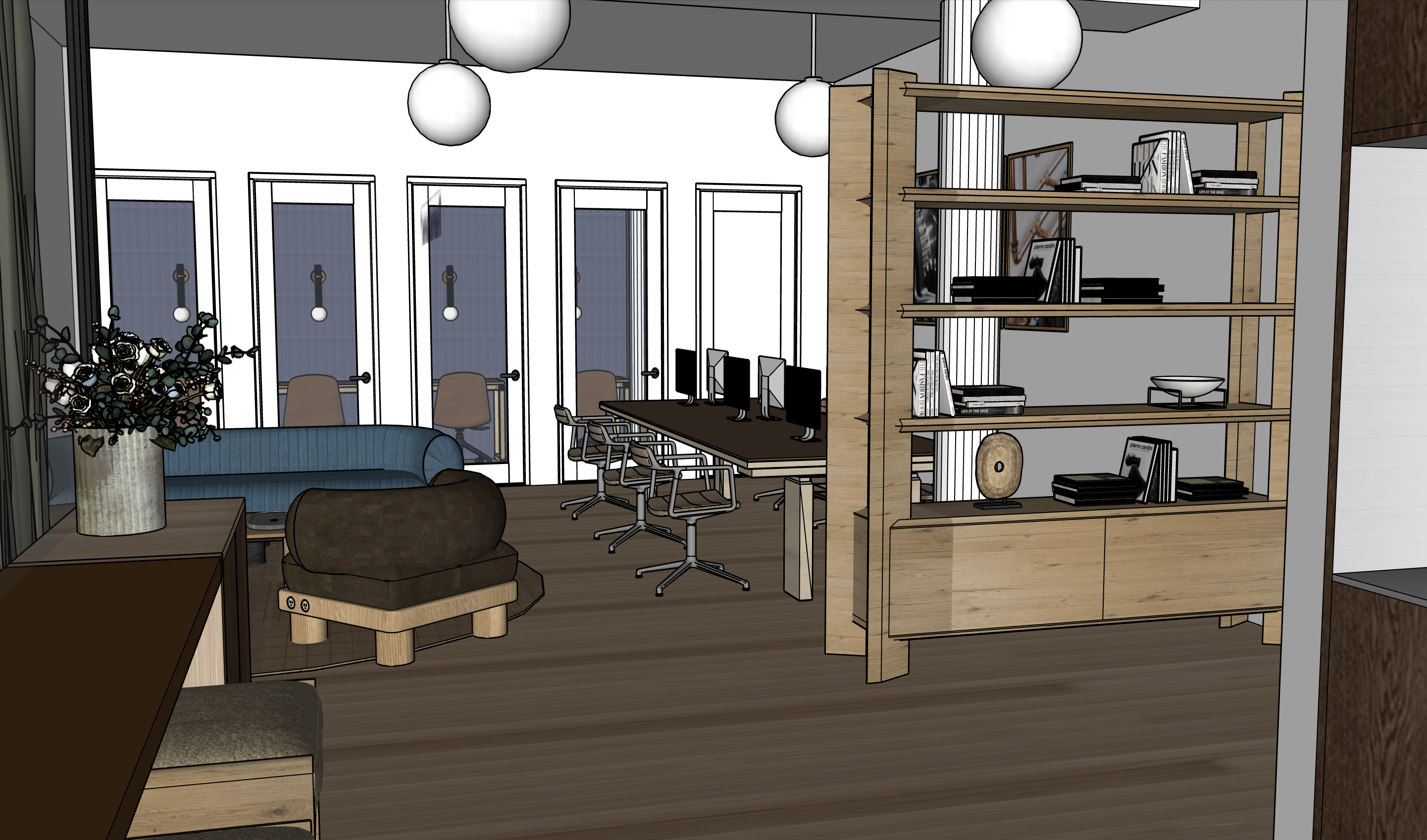 bright natural daylight streaming from a large off frame window on the left creating a diffused warm glow the light falls at a low angle casting long gentle shadows highlighting the tactile surfaces of a navy coduroy sofa and wood furniture subtle contrast between illuminated areas and soft midtones with no harsh highlights the atmosphere feels calm airy and organic with a neutral color temperature slightly warmed by reflected tones from the white oak wood flooring and furnishings light wraps softly around objects emphasizing depth materiality and a quiet residential mood the column is a smooth finish keep all finishes as shown in the image