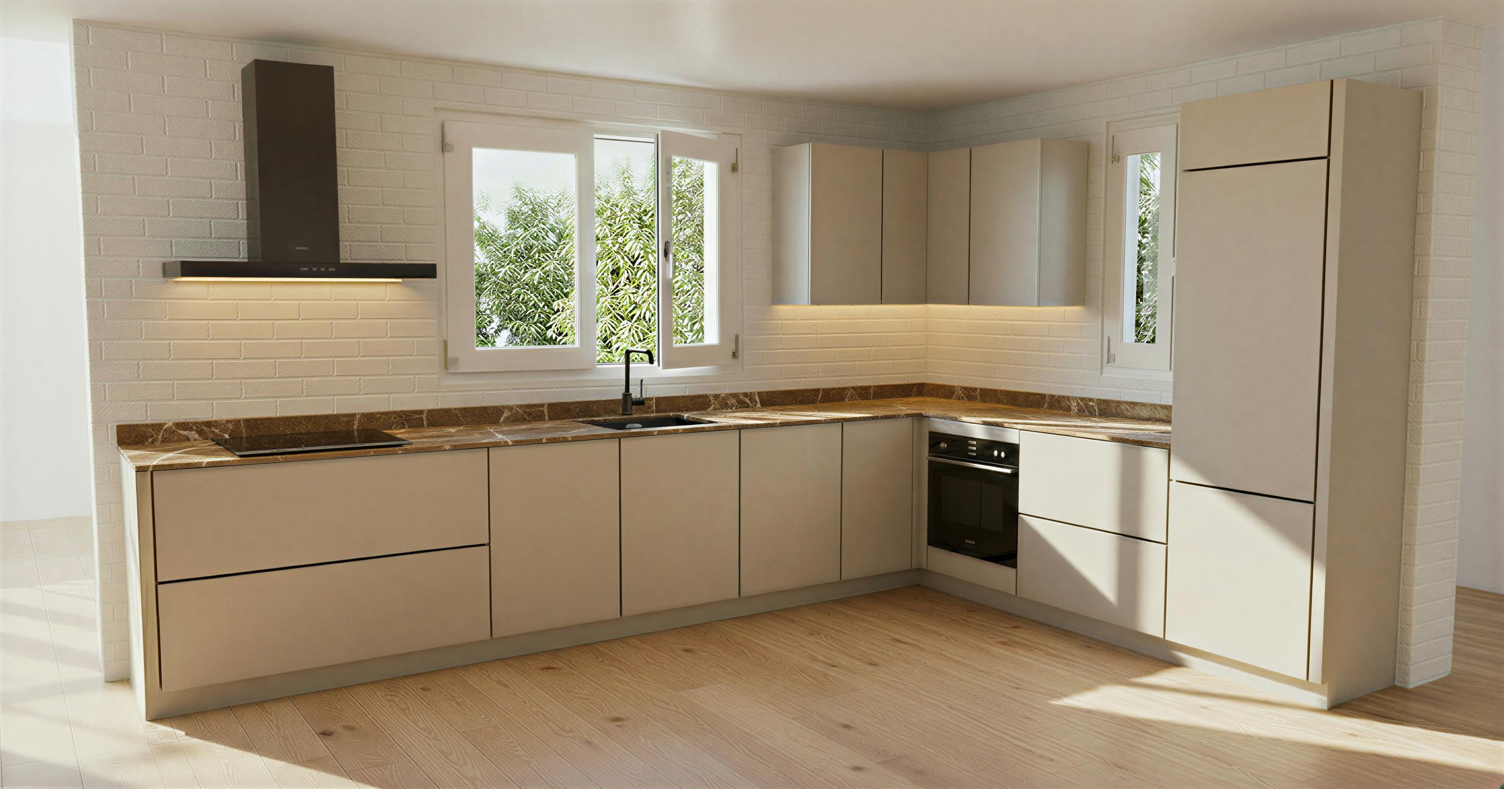cambia el color de los muebles colgantes por un roble natural mant n las 2 ventanas como est n