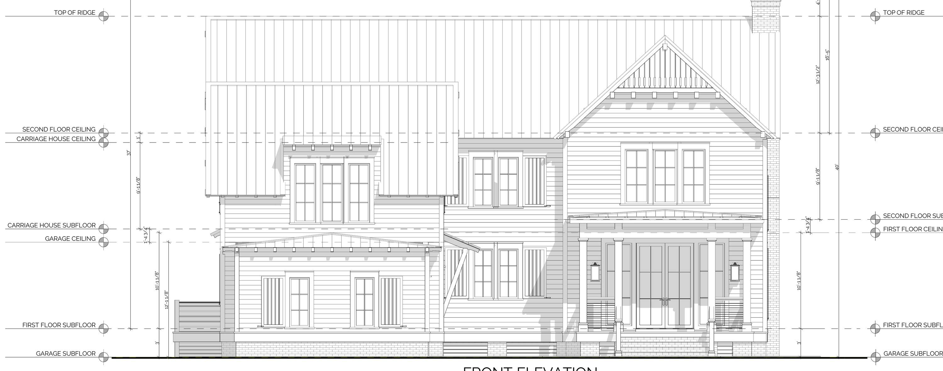 orthographic exterior elevation render from line drawing preserve exact geometry window door positions and rooflines maintain input colors realistic materials with subtle texture neutral daylight minimal shadows no landscaping covering the fa ade body ben moore hc 171 trim ben moore hc 171 roof metal broze window sashes pella putteblack