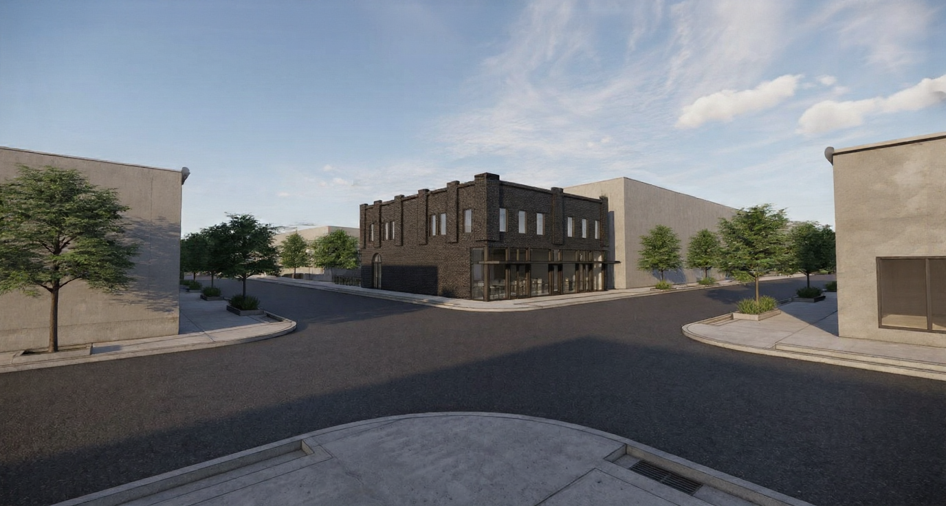 change the concrete buildings to just be light gray massing boxes for context add light to the interior of the brick building to be like a bistro eating dinner activate the sidewalk with pedestrians and street lighting make the vibe happy evening going to dinner the sun slightly setting but not dark