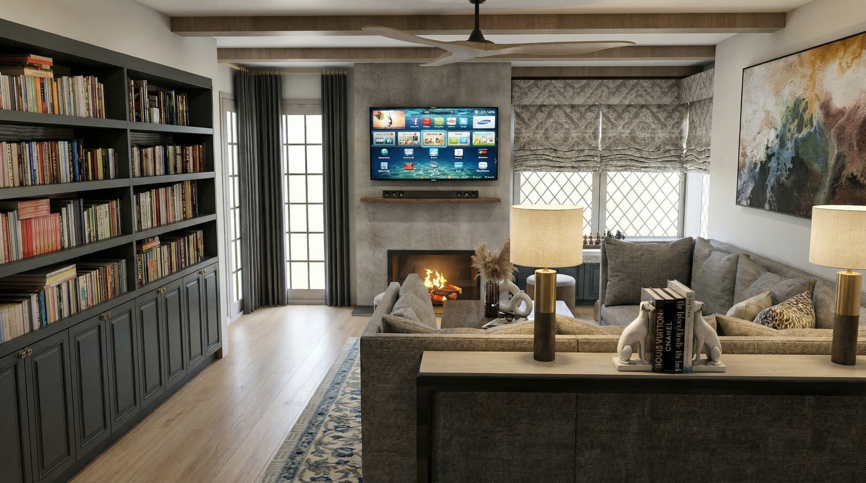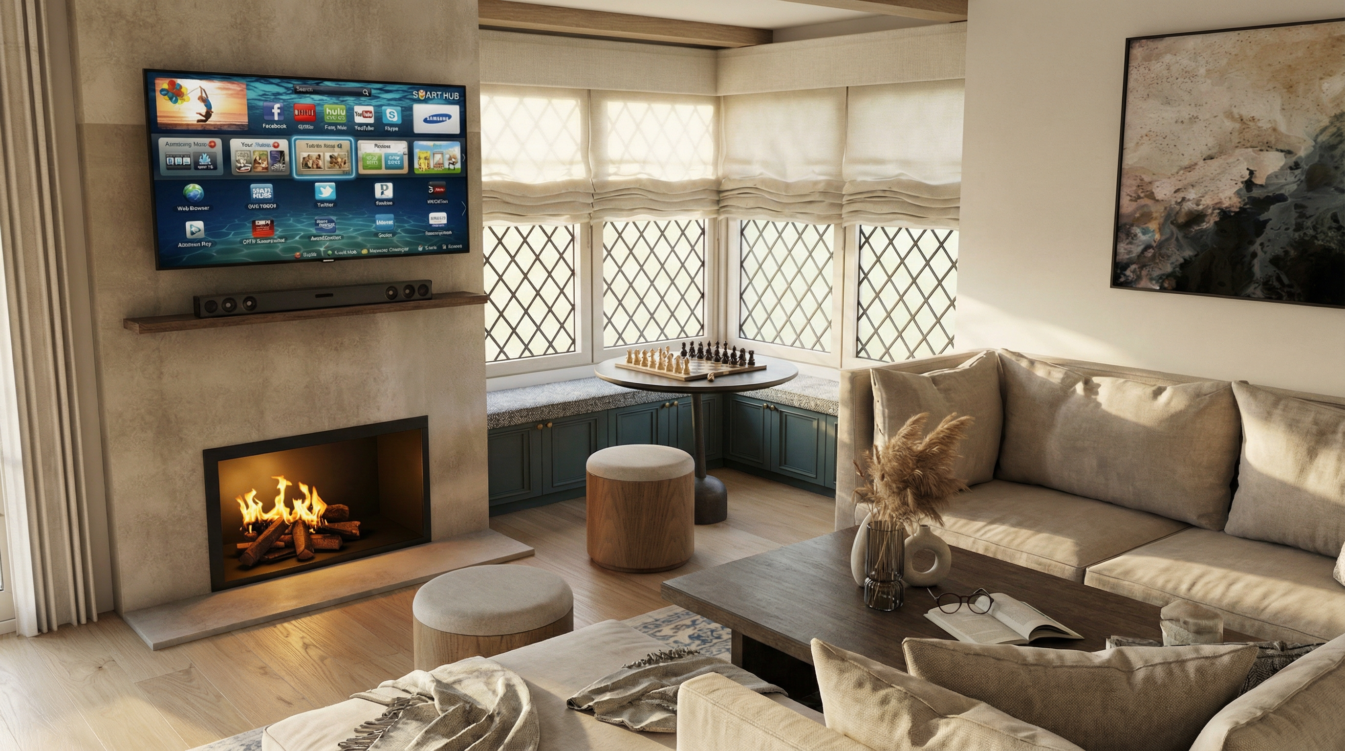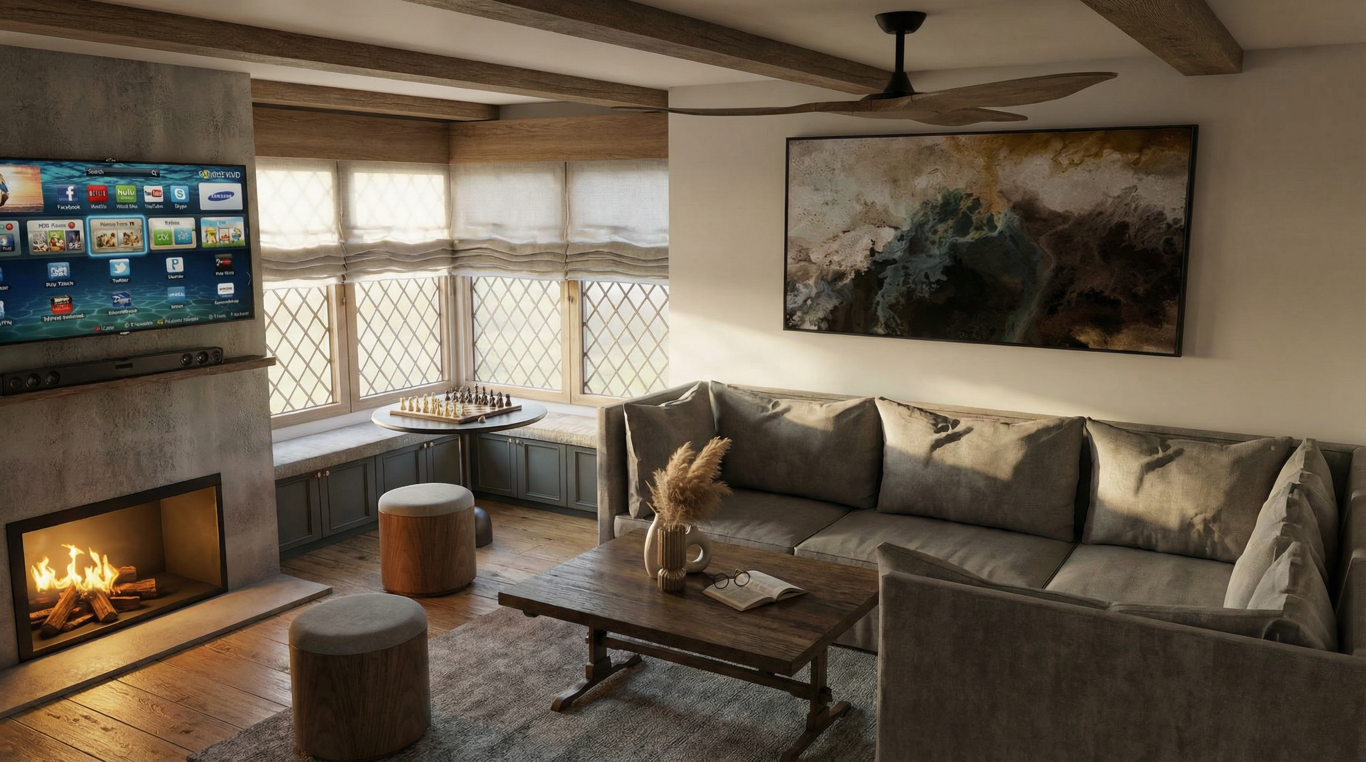 hyper realistic architectural interior photography shot on phase one xf 35mm lens f 2 8 ultra detailed pbr textures with visible micro scratches dust particles and natural fabric weave physically accurate global illumination using path tracing natural sunlight streaming through windows with soft volumetric light shafts and realistic fresnel reflections on polished surfaces realistic light bounce and deep ambient occlusion in corners professional interior styling cinematic color grading with neutral white balance and preserved shadow detail 8k resolution zero noise indistinguishable from a real world location scouting photo reemove dramatic sunlight and make all texture realistic and put on urban setting background