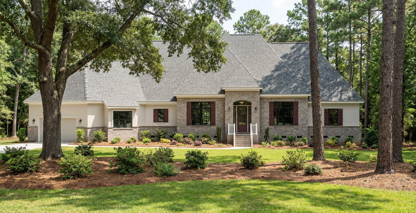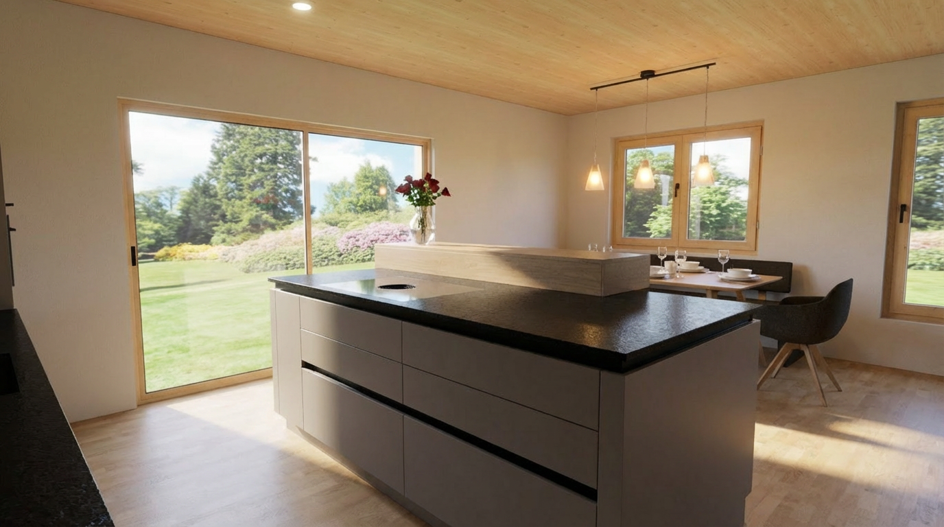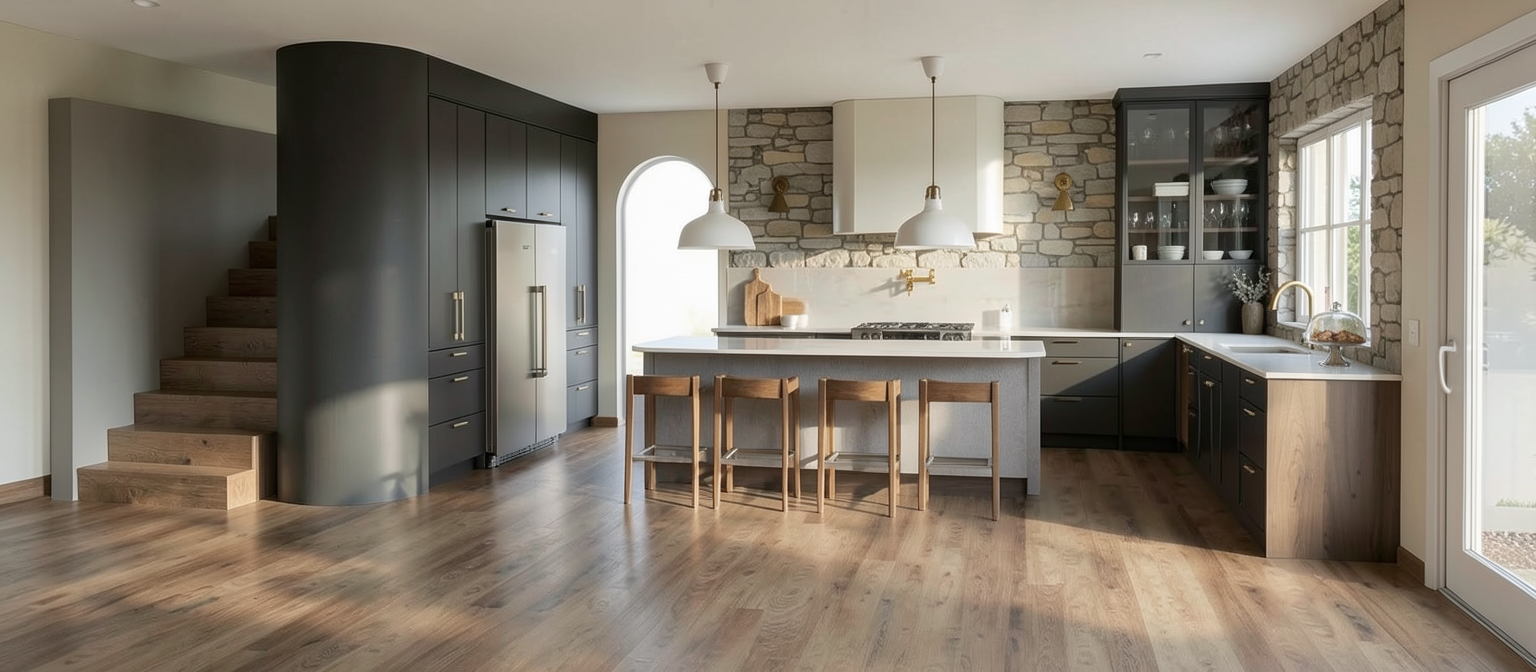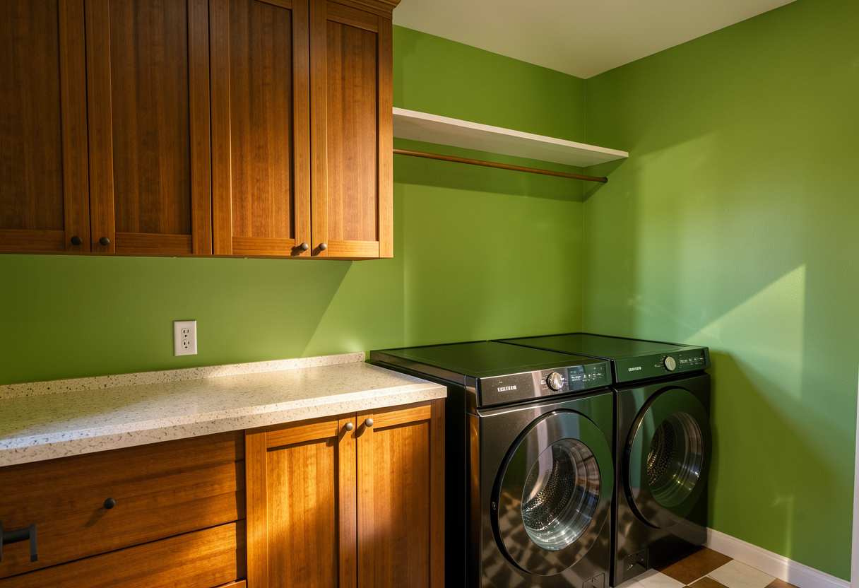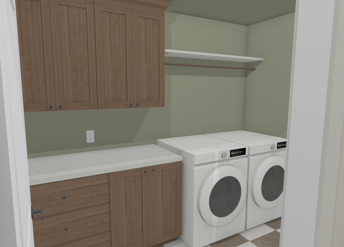 a soft sage laundry room with a checkered floor warm brown cabinets