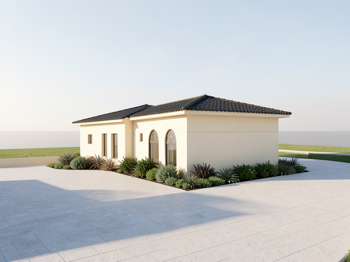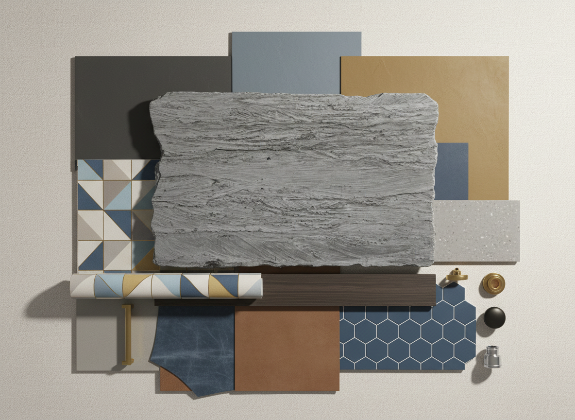 render a high end designer mcm bathroom from the moodboard featuring a slab of adamantum quartzite as the countertop and shower walls show any light fixtures as illuminated and add warm sunlight from nearby windows ensure there are several plants around the space and a companion wallpaper feature behind the vanity