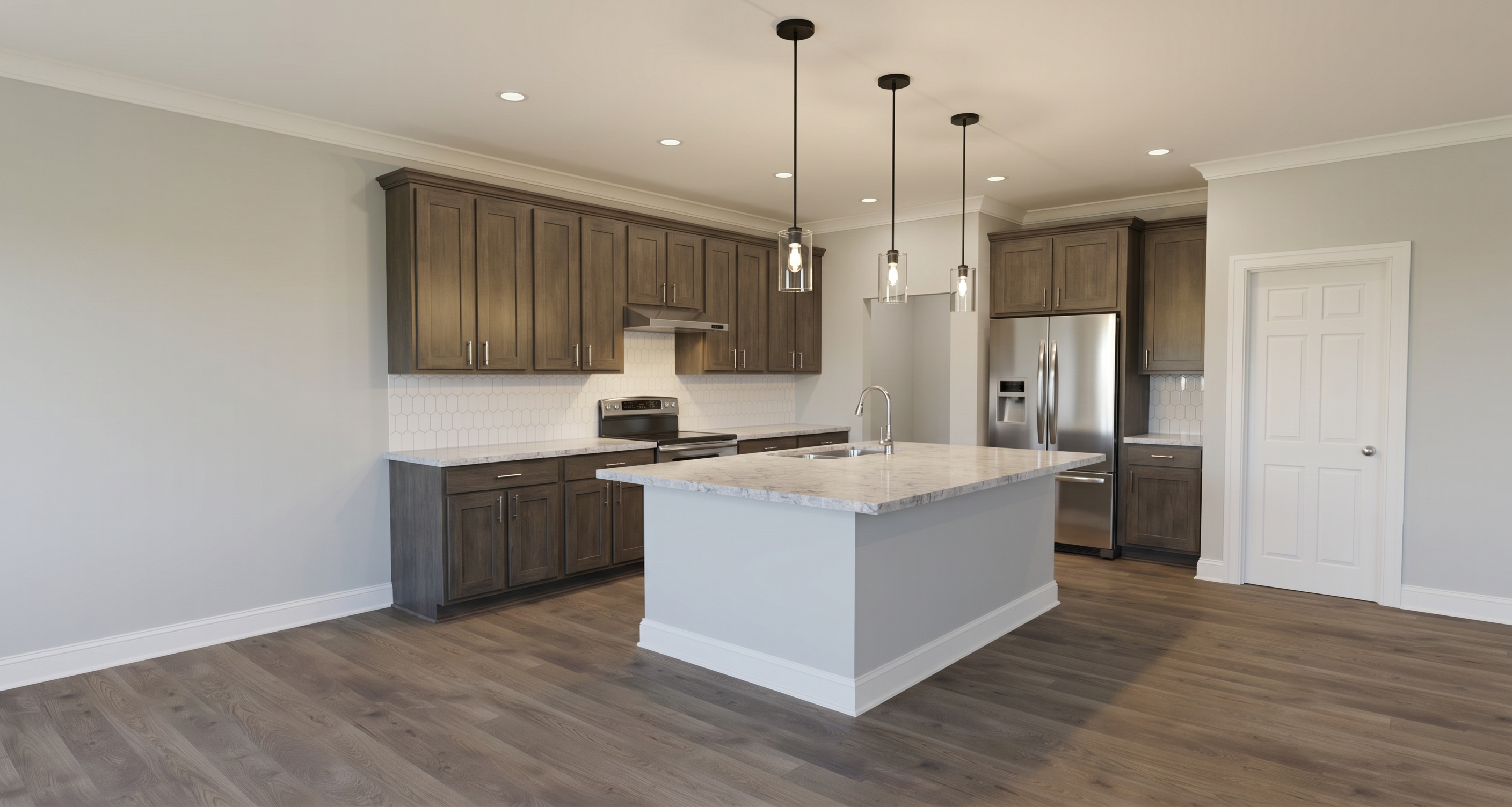 render a photorealistic modern kitchen interior with a cozy and inviting atmosphere features wooden cabinets in a dark gray with warm undertones with satin nickel cabinet hardware with an artic white 3 in wide by 12 in height picket undulated tile backsplash with snow white grout and countertops highlight the sleek stainless appliances and countertop to be dawn mist granite stainless steel undermount double bowl sink with a delta westville single handle pull down kitchen faucet in artic stainless walls in a soft grey e0e2e0 ceiling in a white f7f7f1 base board in a white f7f7f1 show molding in a white f7f7f1 doors in a white f7f7f1 door hardware to be a satin nickel add floor elmwood smoke lvt in a soft cool gray brown cast and a more weathered look than the warmer oak visuals add three one light pendants with a slender design that complements mid century modern transitional and contemporary settings with a simple round canopy suspended over a cylindrical clear glass shade over the island in matte black measures 4 in diameter by 9 75 in height use a warm ambient lighting in the can lights show use a soft ambient lighting to enhance the warm atmosphere color scheme