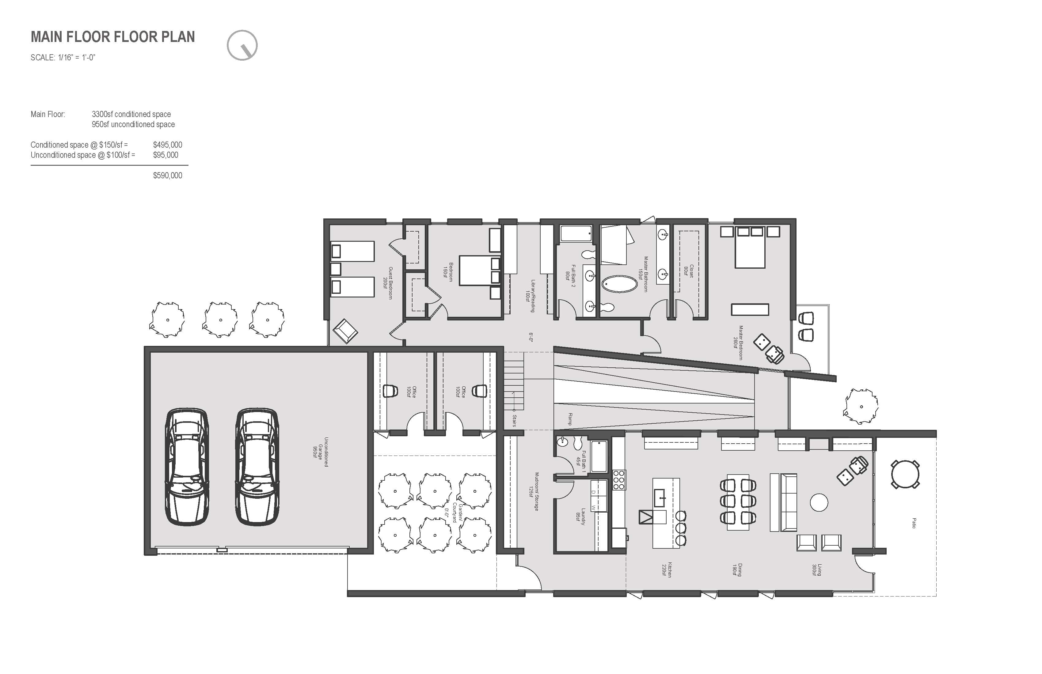 make a render of the entry courtyard with a pivot entry door stone and cedar wood vertically oriented two small home offices beyond river birches and garage side view to the left