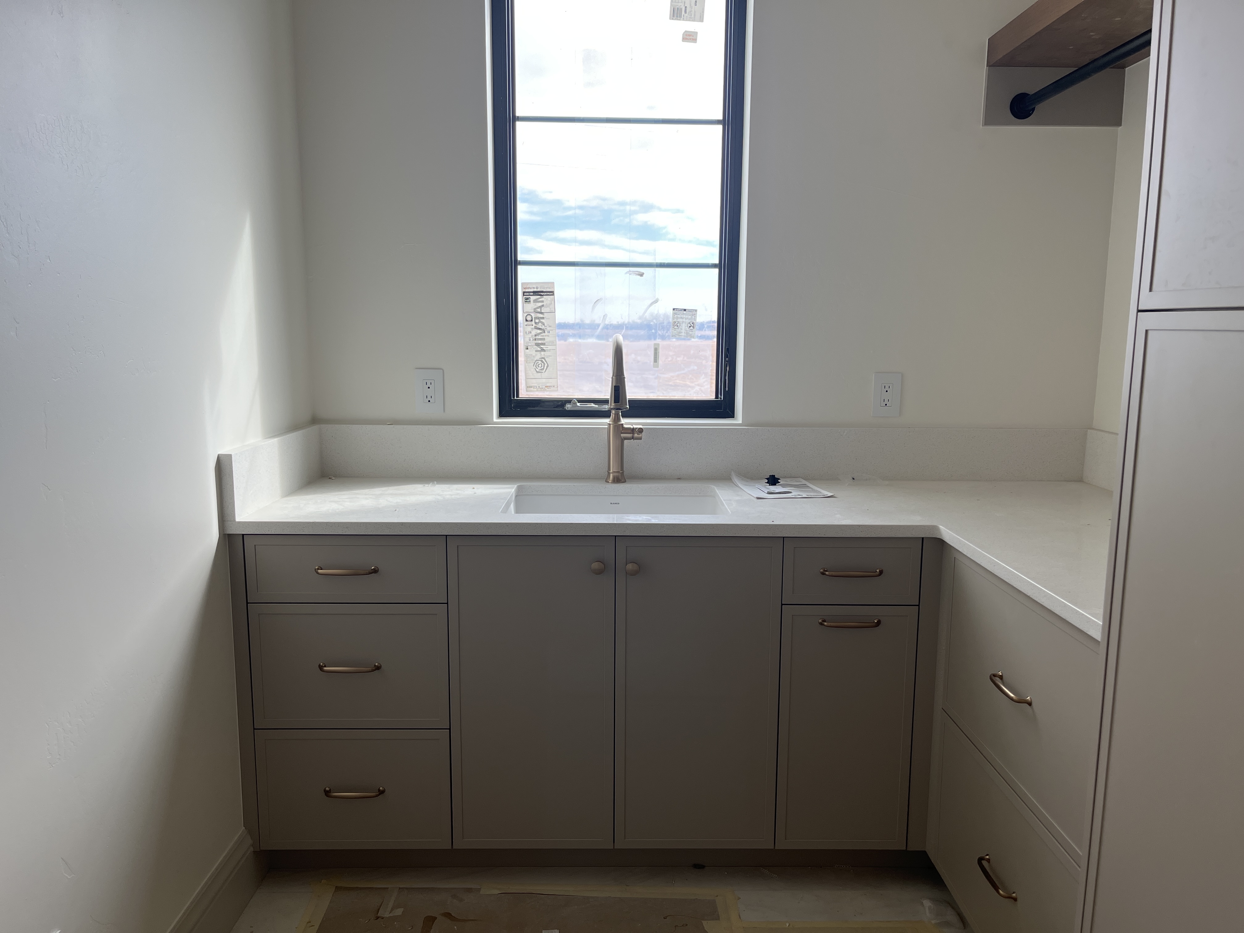 do not change the cabinets at all preserve the exact cabinet colors materials finishes door style drawer style hardware proportions reveals geometry and alignment exactly as shown do not alter the countertop flooring walls ceiling angles perspective lighting direction appliances or any architectural elements keep the camera viewpoint absolutely identical only remove clutter construction materials and unfinished areas clean the room and make it look fully finished add only minimal tasteful staging items appropriate for the space such as a small plant or a folded towel do not add any furniture or change anything about the cabinets countertop or room structure negative constraints no cabinet changes no perspective changes no angle changes no color changes no resizing no shape changes no geometry changes no filler changes no hardware changes no new cabinetry no wall changes no added shadows that distort structure stage the countertop for a laundry room add a shirt hanging from the closet rod add a simple view out the window