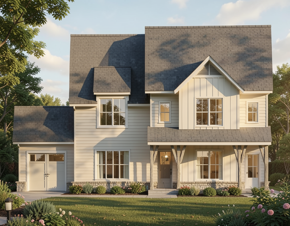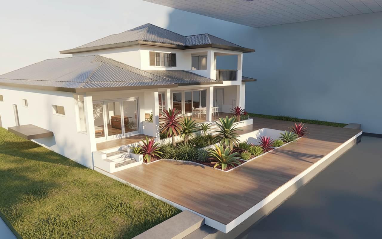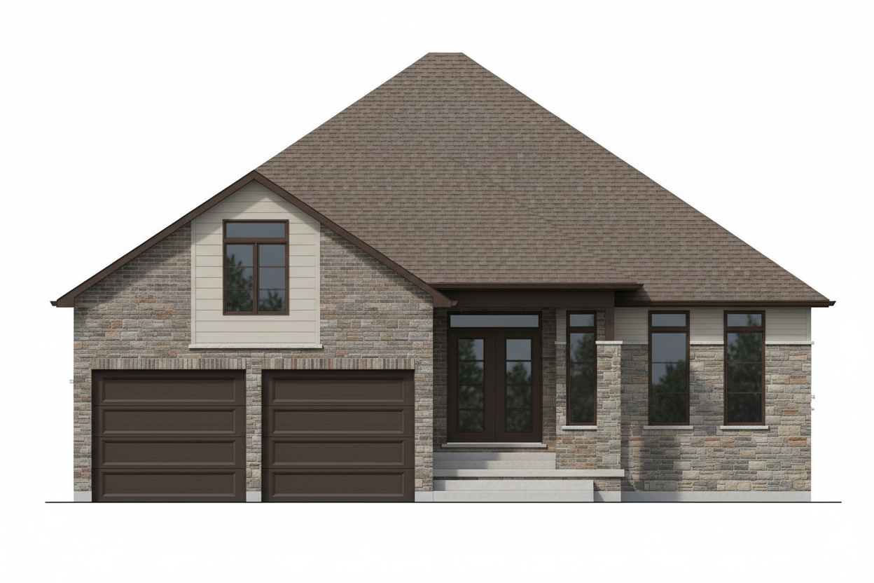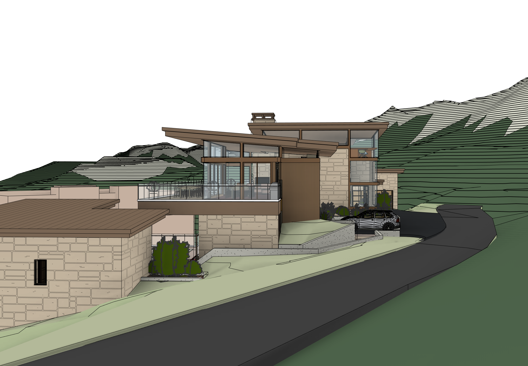 prompt use this exact revit 3d view do not alter geometry proportions camera position or architectural elements in any way render a frank lloyd wright inspired colorado mountain modern rustic home the architecture should feel grounded horizontal and integrated into the landscape with a strong sense of permanence and craft material palette layered natural stone warm grey sandstone tones with deep horizontal coursing rich timber elements dark walnut cedar or weathered oak subtle steel detailing in dark bronze or blackened finish low reflective glass with slight warmth architectural expression emphasise strong horizontal lines and deep overhangs thick roof planes with minimal pitch heavy grounded base anchoring the structure to the built in elements benches planters integrated into the architecture lighting mood golden hour or early evening light warm interior glow spilling outward soft cinematic shadows with high realism environment colorado alpine setting with pine trees rugged terrain and distant mountains natural slightly rugged landscaping not manicured optional light snow dusting or dry autumn ground styling lived in but restrained no clutter minimal timeless outdoor furniture in wood metal subtle signs of habitation soft lighting slight wear rendering quality ultra realistic high detail textures soft atmospheric depth balanced contrast not overexposed architectural photography style slightly low angle hero shot