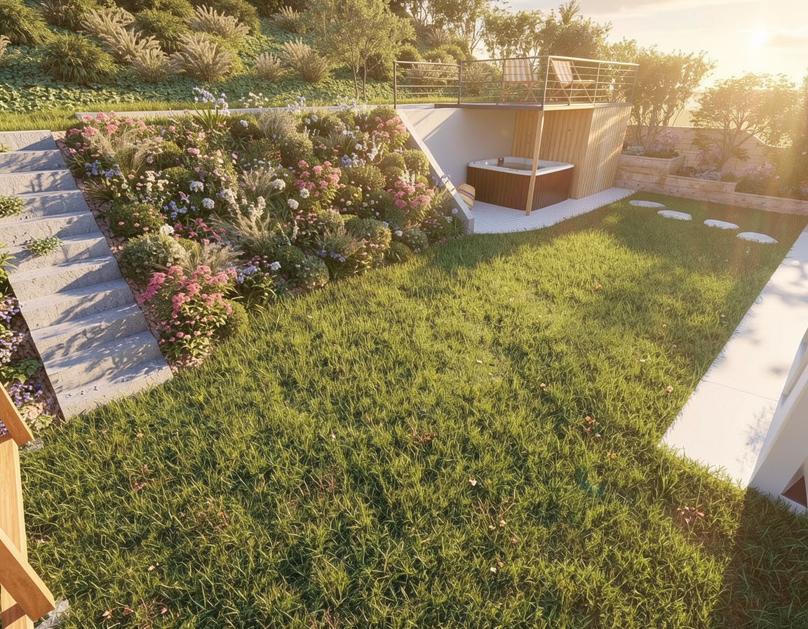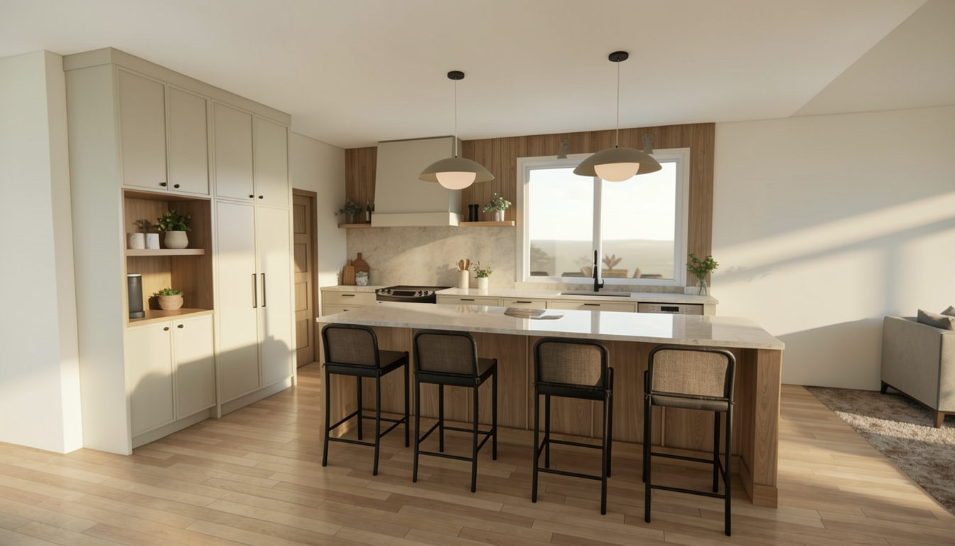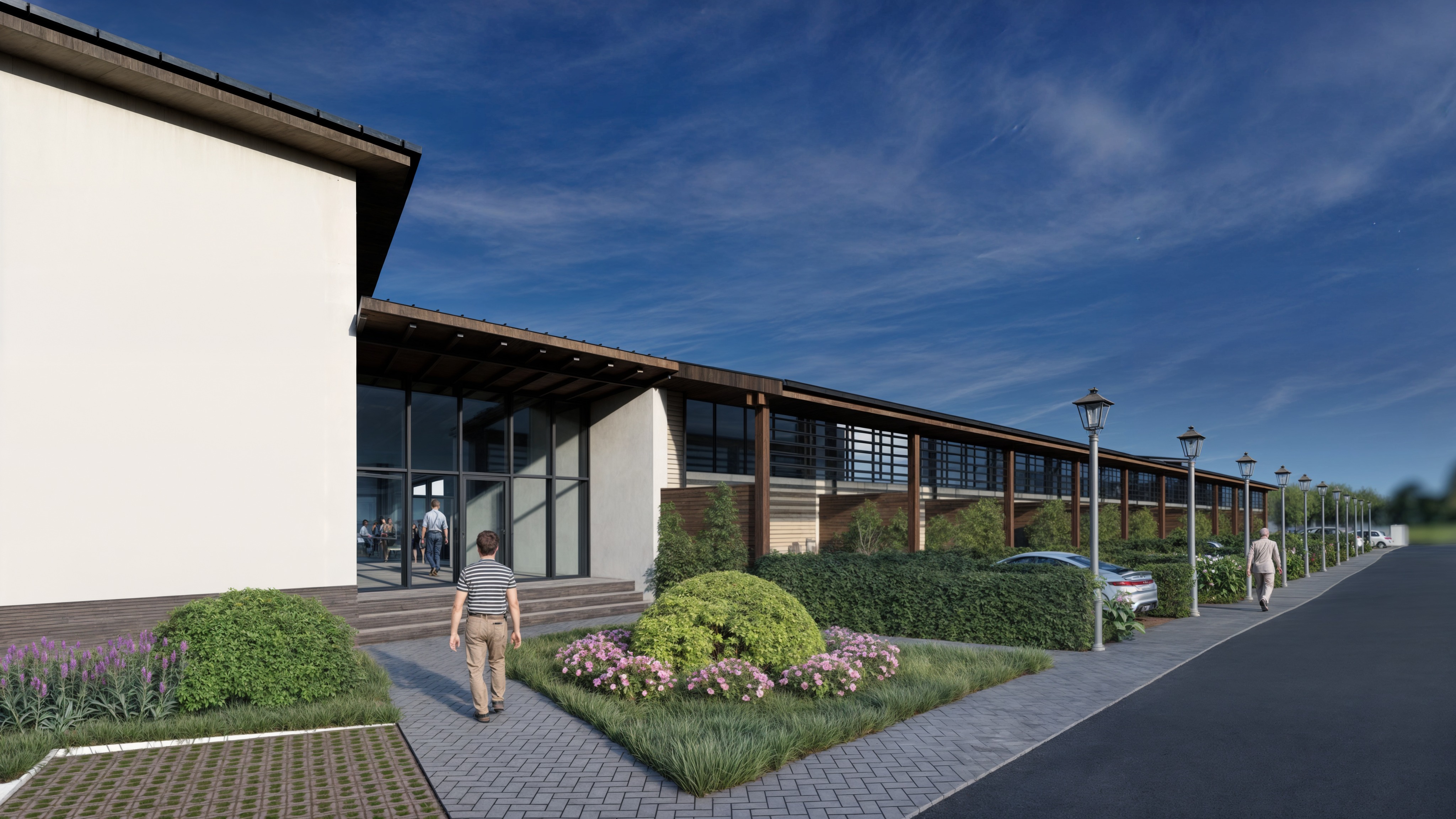 a modern residential complex entrance featuring a clean white plaster facade combined with dark rich toned wooden cladding the architecture is elegant and minimal with a transparent glass entrance and a long covered walkway supported by slender wooden columns the wood elements have a deep warm tone creating a strong contrast with the light facade and enhancing the premium character the scene is illuminated with warm soft natural light creating a cozy and inviting atmosphere the asphalt road and paved walkways appear slightly wet with subtle reflections that enhance realism and add depth the lighting is golden and directional with soft shadows and gentle highlights on materials landscaping includes carefully arranged shrubs ornamental grasses and flowering plants creating a clean and well maintained environment decorative street lamps line the walkway reinforcing a calm and residential ambiance people are naturally walking toward the entrance adding life and scale to the scene the overall mood is cozy modern and high end with a photorealistic architectural visualization and a warm welcoming atmosphere