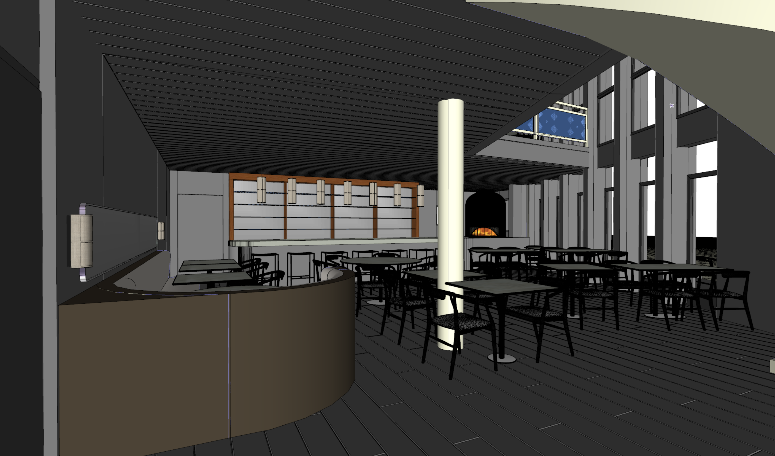 elegant yet relaxed tennis club restaurant in geneva bright and airy interior natural daylight warm honey toned wooden parquet flooring with a slightly ochre hue burgundy stone bar counter wooden chairs in warm tones bar stools with metal structure and woven leather seats back bar in wood and mirror with warmer richer wood tones soft warm lighting white ceiling and white walls to keep the space luminous tables in ochre and deep green tones inspired by clay tennis courts sheer curtain drapes filtering natural light refined but not overly luxurious cozy atmosphere realistic high end interior design subtle greenery people dining balanced composition a continuous rounded built in wooden banquette seamlessly integrated into the architecture no plants in the back left area on the right side immediately upon entering the space a curved floating sculptural staircase is visible only partially just a glimpse of it as it is located directly near the entrance rather than at the back above the left side banquette incorporate a curated gallery of framed vintage tennis posters instead of the mirror adding a nostalgic graphic and elegant accent to the space elegant yet relaxed tennis club restaurant in geneva bright and airy interior natural daylight warm honey toned wooden parquet flooring with a slightly ochre hue burgundy stone bar counter wooden chairs in warm tones bar stools with metal structure and woven leather seats back bar in wood and mirror with warmer richer wood tones soft warm lighting white ceiling and white walls to keep the space luminous tables in ochre and deep green tones inspired by clay tennis courts sheer curtain drapes filtering natural light refined but not overly luxurious cozy atmosphere realistic high end interior design subtle greenery people dining balanced composition a continuous rounded built in wooden banquette seamlessly integrated into the architecture no plants in the back left area on the right side immediately upon entering the space a curved floating sculptural staircase is visible only partially just a glimpse of it as it is located directly near the entrance rather than at the back keep the same architecture than the original image