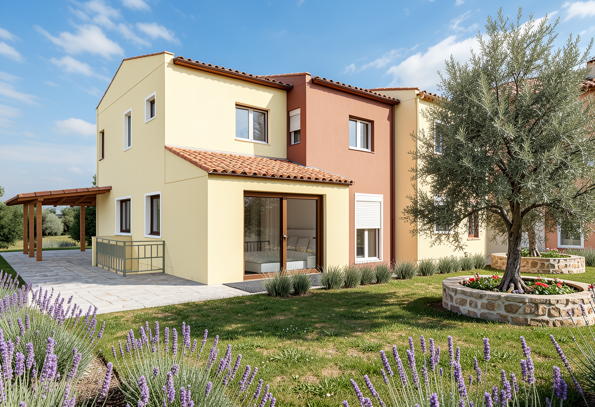 a highly realistic architectural photograph of a mediterranean residential property with three houses arranged side by side the left and right buildings have light yellow colored concrete plaster exterior walls while the middle building features terracotta colored concrete plaster exterior walls all building walls have natural soft matte colors with visible concrete texture not shiny or glossy window color constraint all windows must be white only two specific windows are dark brown the single window on the ground floor of the left building one front facing window no other windows are allowed to be dark brown or any other color do not change or reinterpret this rule traditional terracotta tile roofs on all buildings the existing tree in the image should be replaced with an olive tree maintaining its original position and scale the tree should have natural matte foliage not shiny or glossy do not add any extra trees or objects keep the already existing plants in front of the houses as lavender preserving their exact position and layout include only one stone flower bed around the olive tree made of irregular natural shaped stones not uniform or perfectly cut do not add any extra flower beds keep the ground surface with a mix of grass and stone tile paving as in the original image preserve the ground floor pergola with its tile roof exactly as it is without any modifications bright natural sunlight at 10 am coming from the left casting soft realistic shadows blue sky with scattered clouds in the distance a calm sea visible on the horizon adding depth to the background calm village residential atmosphere keep original details from the uploaded image preserve all architectural elements and maintain the exact same camera angle and composition without any changes do not generate any extra buildings extremely photorealistic architectural photography natural light behavior realistic textures visible concrete material detail subtle imperfections no stylization 8k resolution sharp focus wide angle lens professional composition true to life materials