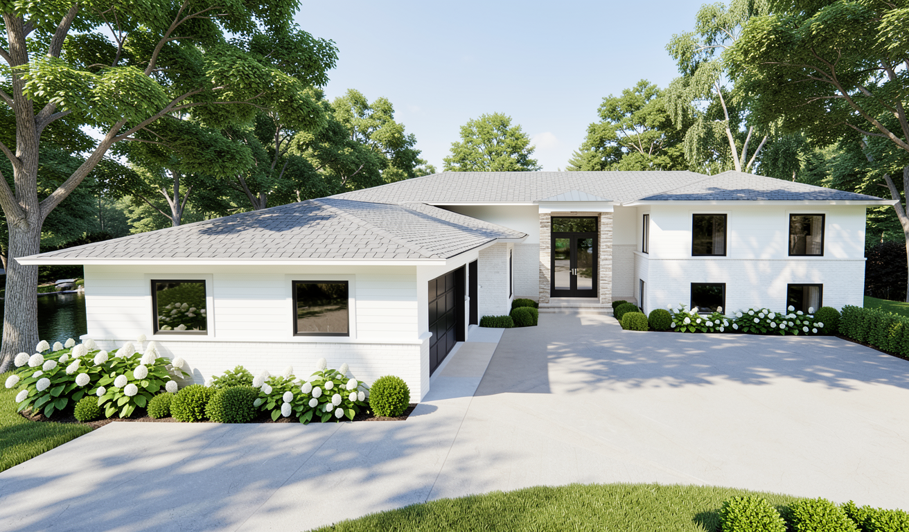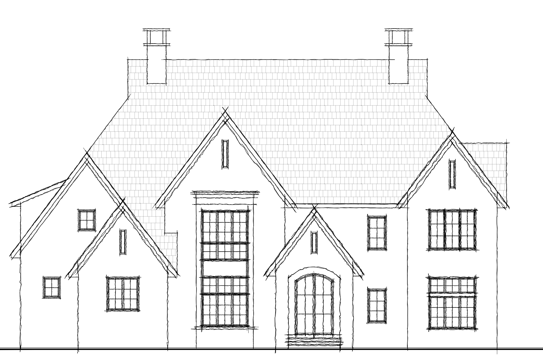 please do not cut off either end of the sketch keep full size make this sketch look like a high end real estate photo of a stunning european transitional style home exterior in a monochromatic warm taupe color palette the facade is a mix of warm taupe textured brick and natural stone features steep overlapping gables and large gridded windows with frames finished in a matching warm taupe or soft sand colored trim to blend with the masonry the grand entrance has a sweeping archway with custom wooden double doors the entire roof consists of high quality dark charcoal architectural shingles with no metal accents beautifully landscaped front yard with layered shrubs and a flagstone path soft diffused daylight hyper realistic architectural digest style sharp focus