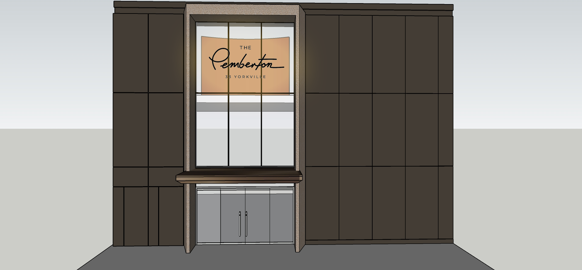 create a photorealistic architectural rendering using the provided sketchup model as the base geometry this is the entrance of a luxury condominium building with a prominent canopy maintain the existing proportions and architectural elements from the model a rectangular canopy projecting above the entrance glass curtain wall above the canopy revealing the slab of the upper floor behind the curtain wall there is a feature wall with rounded edges panels in a warm orange brown tone with the building logo centered and backlit with soft led lighting the main entrance doors below the canopy should be glass with elegant metal framing materiality and style facade cladding in dark bronze warm brown metal panels with subtle joints canopy structure finished in brushed bronze or dark champagne metal glass should look clear and reflective showing subtle interior reflections feature wall panels above should look textured and softly curved in a warm terracotta burnt orange color lighting very important warm architectural lighting 3000k integrated above the canopy washing the upper wall and curtain wall recessed downlights under the canopy creating a rhythmic grid of warm light similar to a luxury hotel entrance soft led backlighting behind the logo on the orange brown feature wall subtle vertical lighting accents on the sides of the entrance atmosphere and realism evening or dusk setting to emphasize lighting cinematic lighting and reflections on the metal and glass highly realistic materials global illumination and soft shadows luxury residential aesthetic similar to a high end hotel or yorkville condominium entrance clean urban sidewalk in front of the entrance camera eye level frontal perspective centered on the entrance