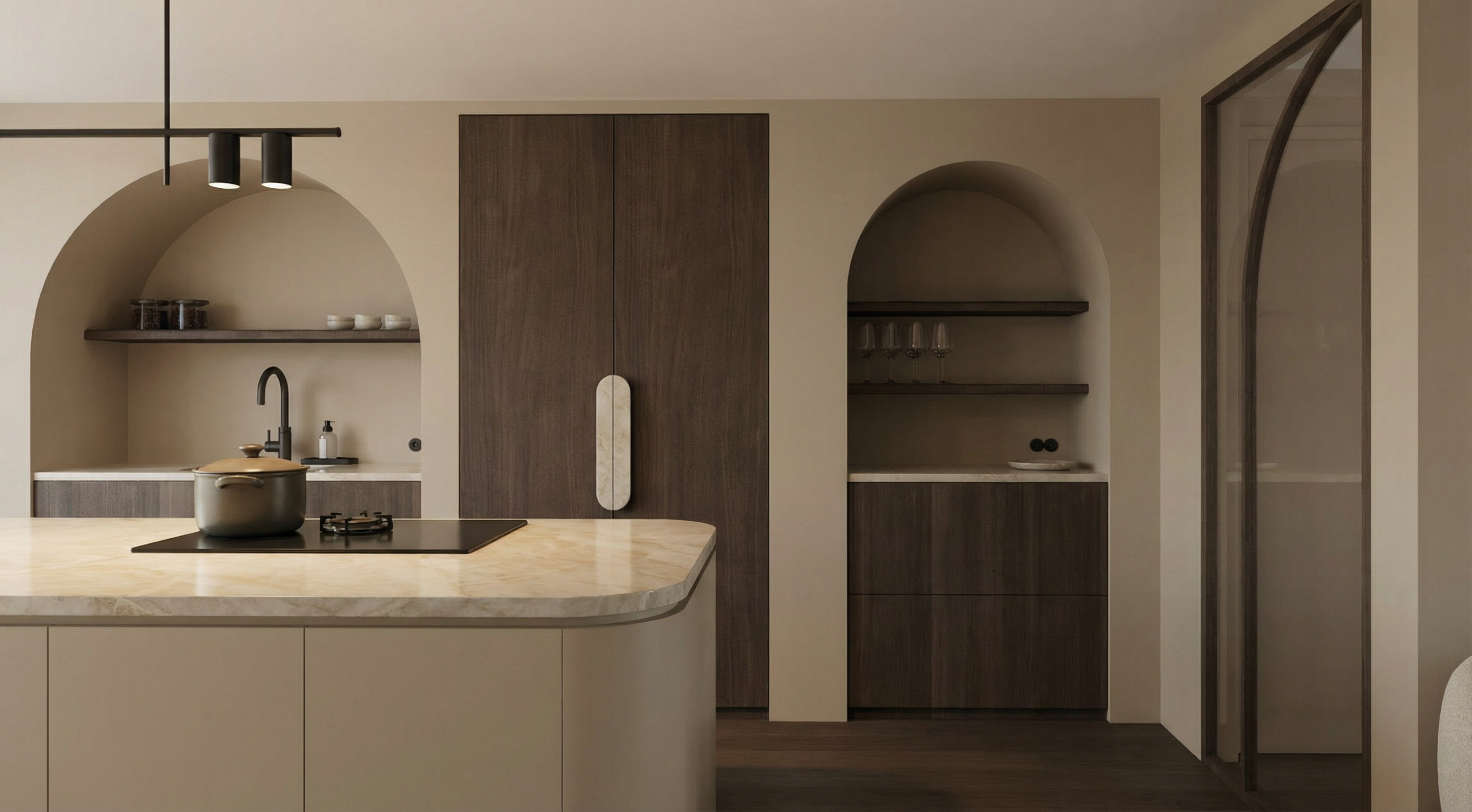 make the kitchen countertop in taj mahal stone matching the oval handles on the tall cabinets and paint the bottom part in beige miral paint install an led strip under the shelves and make the counter top less glossy