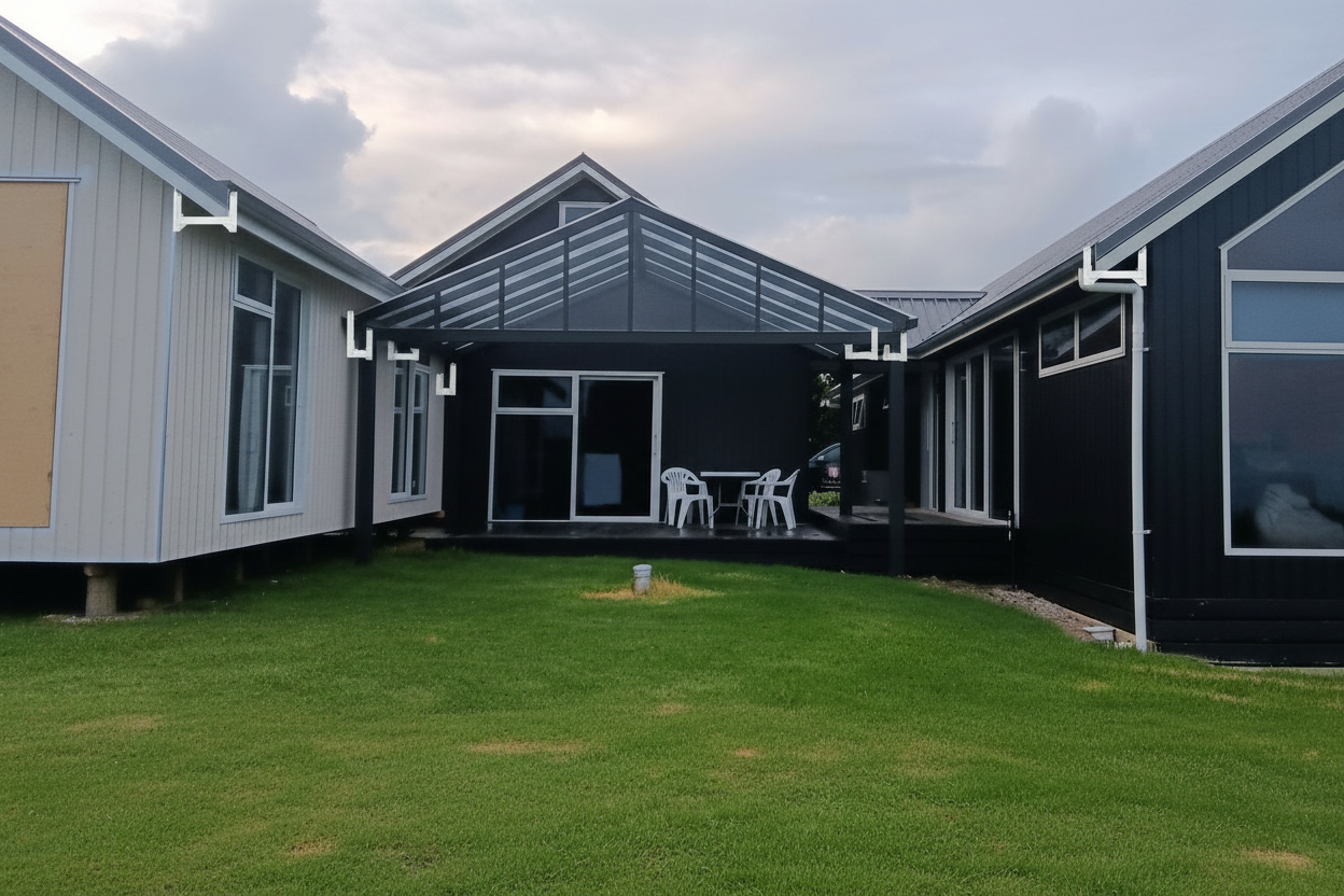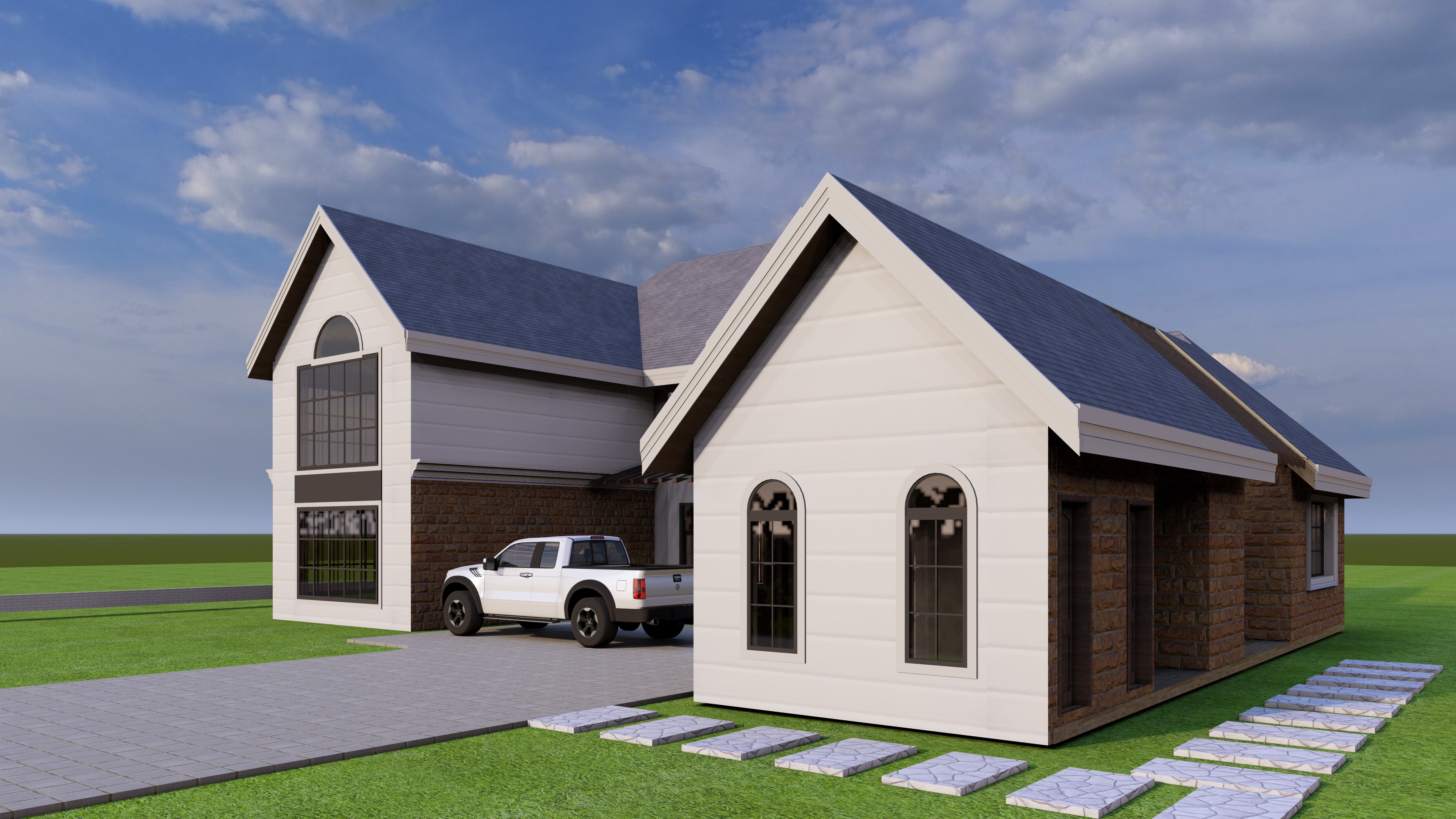 add few trees and vegetation for context white walls only white walls should have very clear horizontal key line pattern spaced at 400mm vertically all brown walls must have beidge machine cut stone car must be a modern double cab