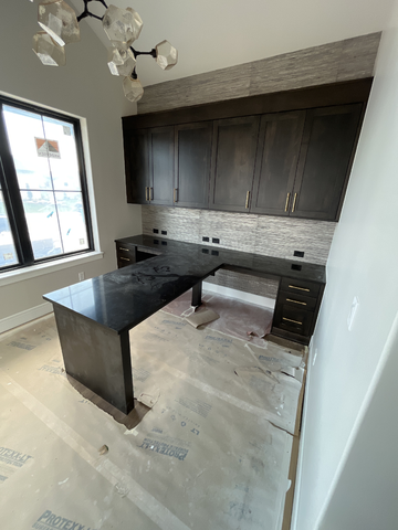 do not change the cabinets in any way preserve the exact cabinet colors materials finishes dimensions door and drawer styles hardware spacing alignment and all geometry exactly as shown do not alter the countertop shape backsplash appliances flooring lighting fixtures or wall structure only remove the construction materials clutter and mess from the scene clean the room and make it look finished and staged add a few simple tasteful home accessories appropriate for the style of the space but do not add or remove any furniture windows or architectural elements maintain the original lighting direction and realism enhance clarity and polish the photo while keeping the cabinetry and room design completely unchanged do not alter the lighting to keep the cabinet colors as they are in the image add flooring desk chairs to both sides of the table change the countertops to white quartz stage for a modern shared office add a nice view out the window