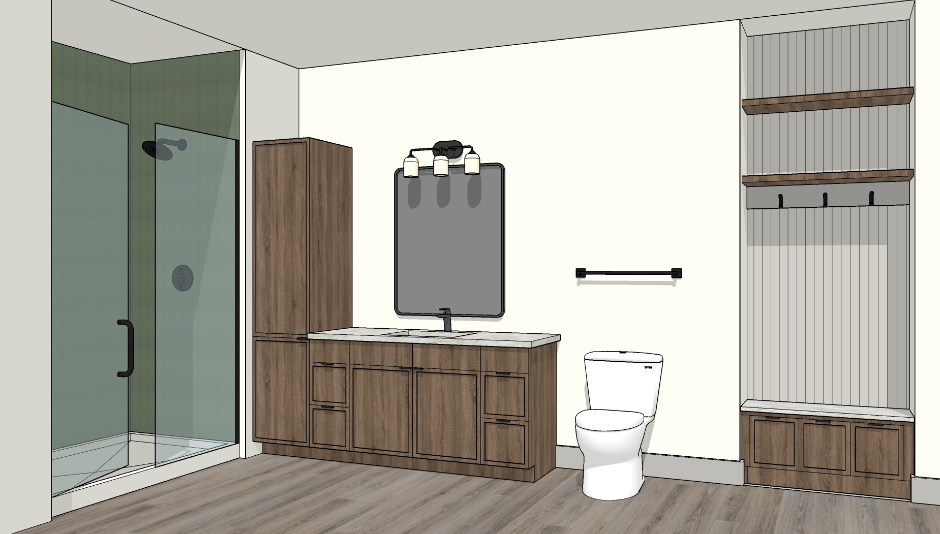 just like the last render but with this bathroom image make the shower tile a nice sage green with a little variation in the tile for an organic look keep the tile pattern the same with a 3x12 vertical stack