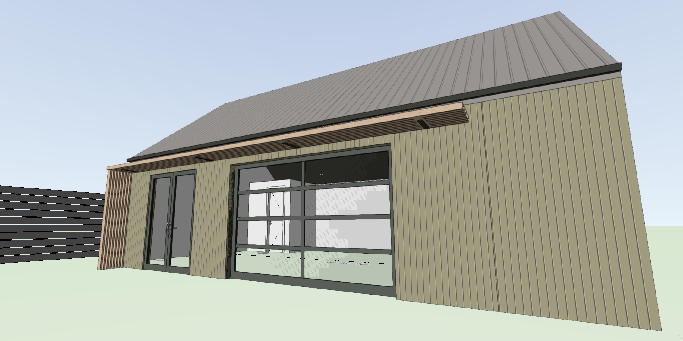 put grey brick pavers in front of large door add trees behind structure and fence add wisteria growing on the brown awning but leave some of the awning visible